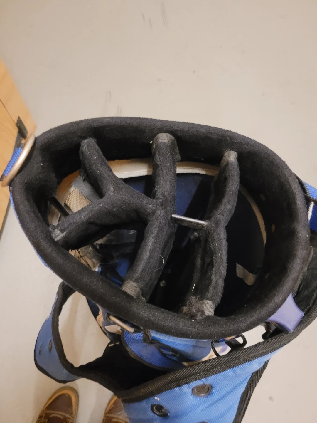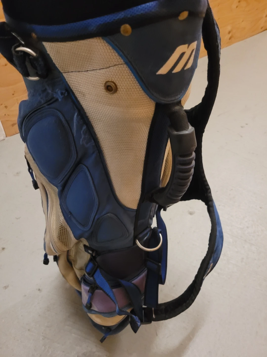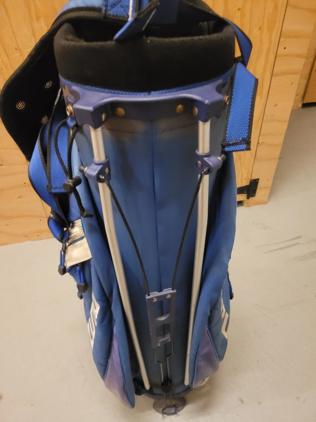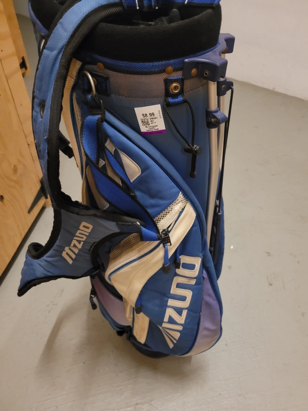 Mizuno golf bag in blue. Features multiple compartments and a strap for easy carrying. It's great for a round of golf!