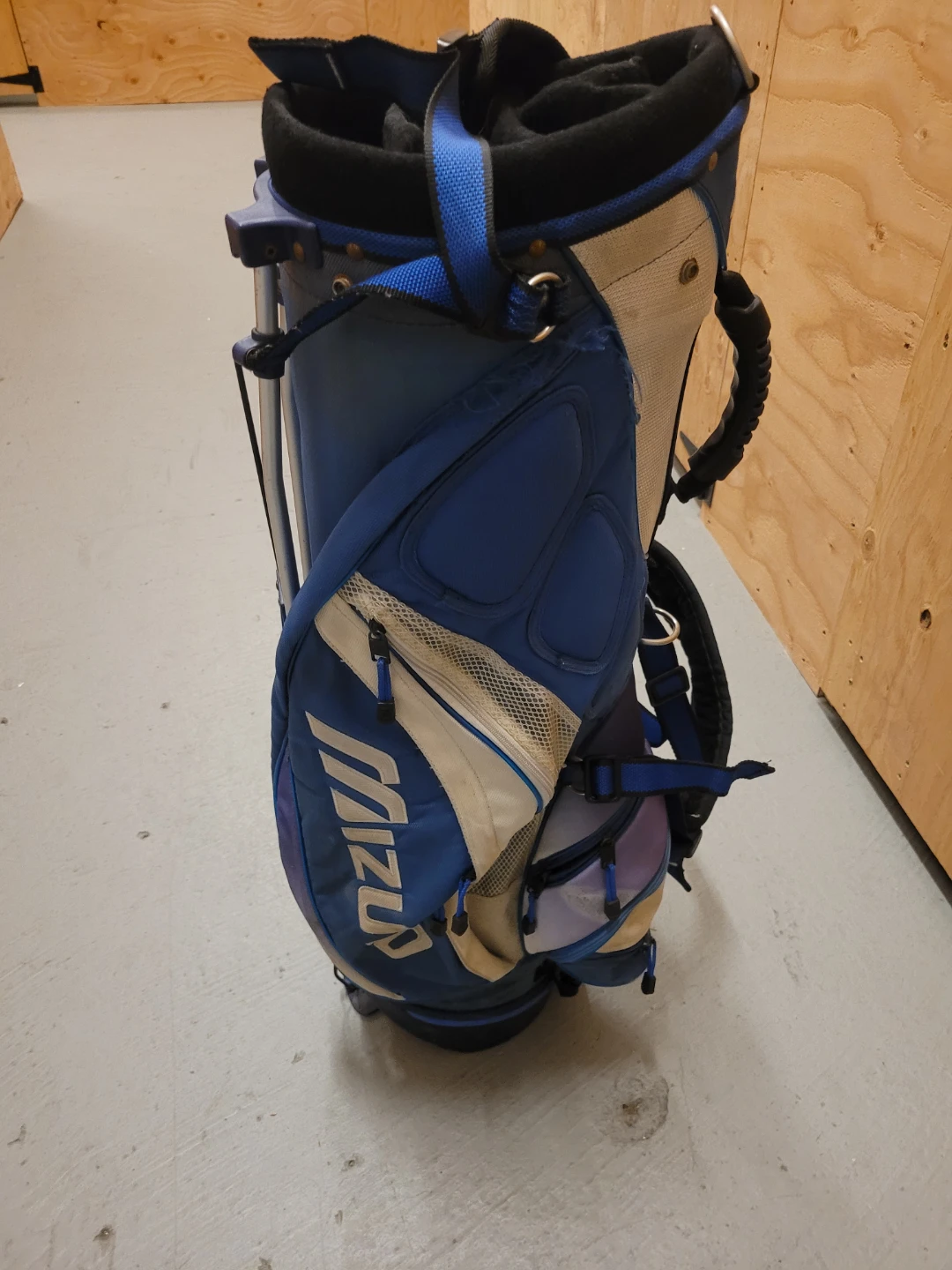 Mizuno golf bag in blue. Features multiple compartments and a strap for easy carrying. It's great for a round of golf!