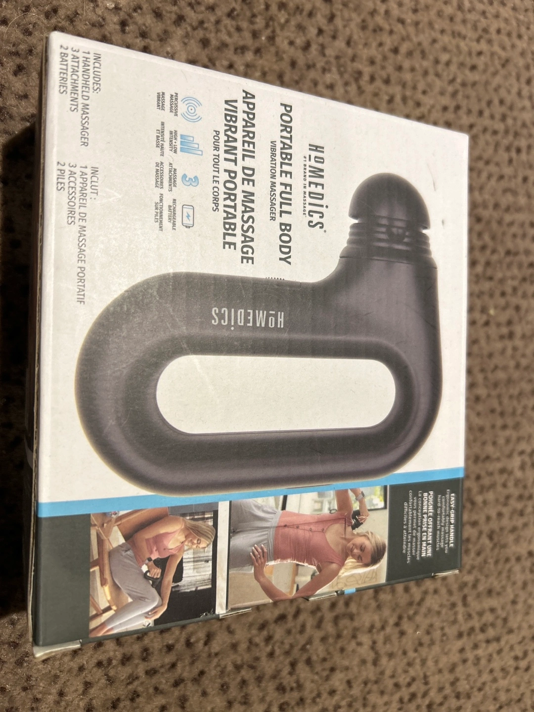 Handheld massager, three attachments, two batteries. Rechargeable. Easy-grip handle. Multiple intensity settings.