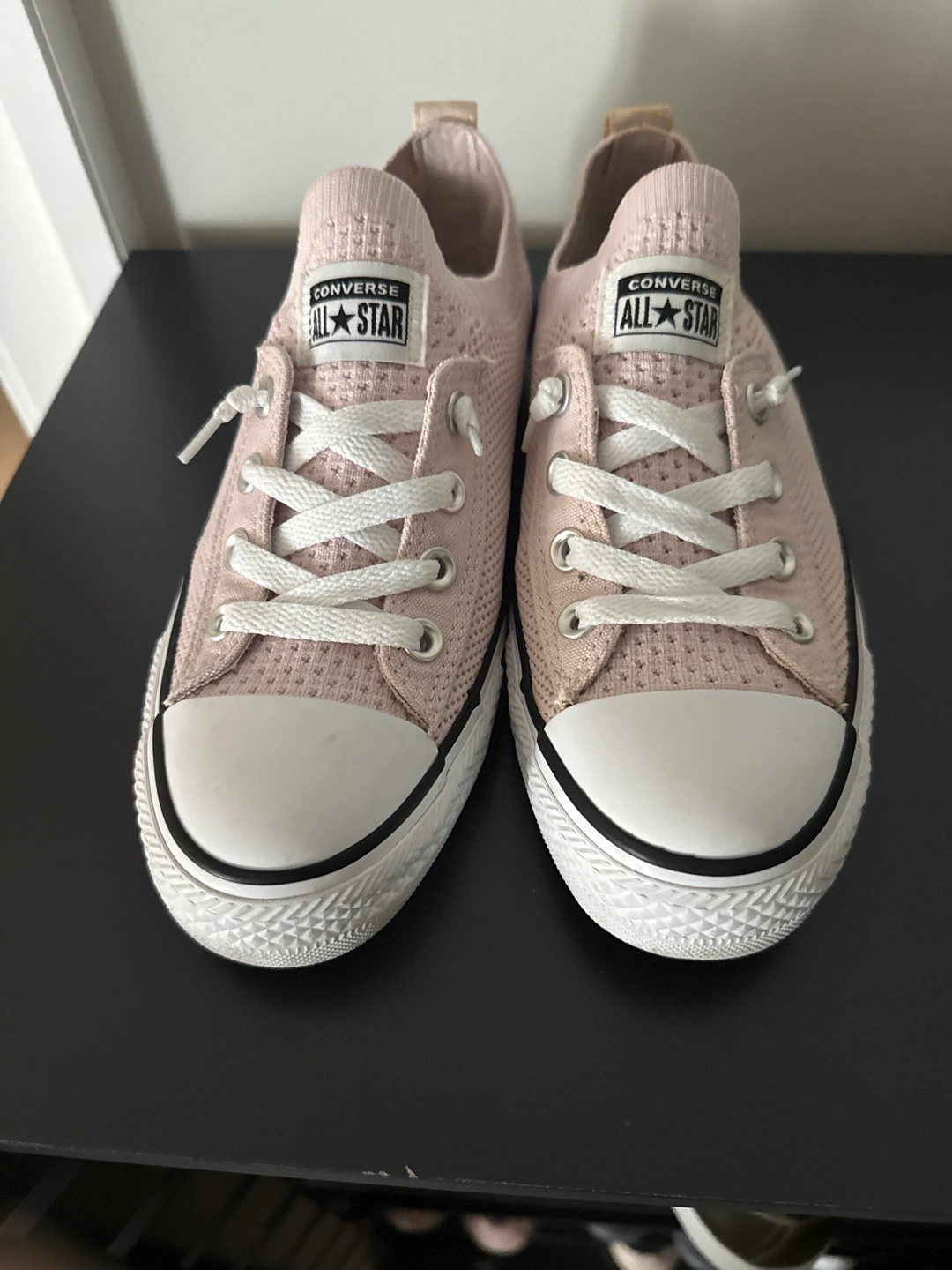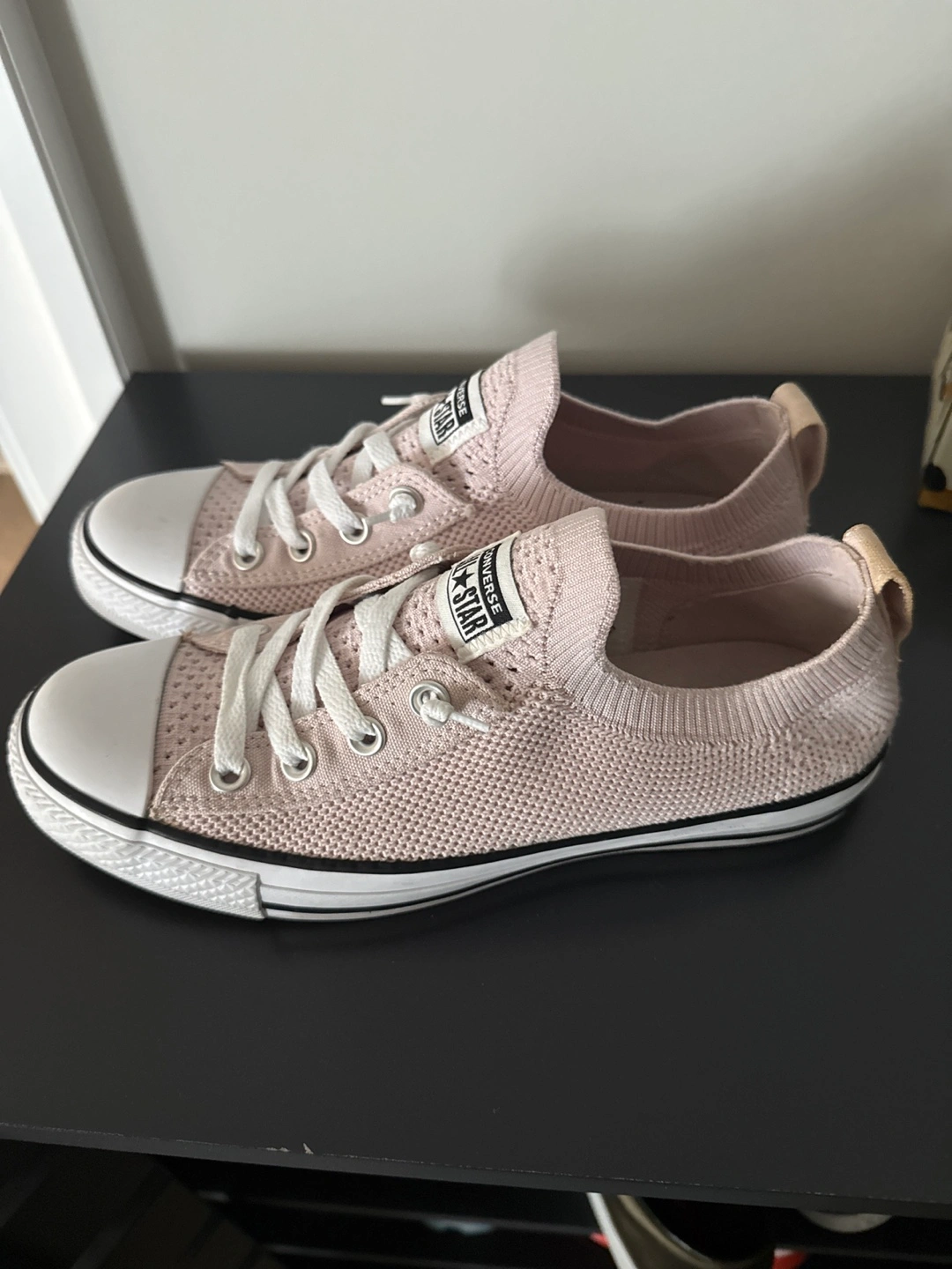 Lovely Converse sneakers. Pink knitted uppers. White laces, and toe caps. Side soles with black stripe. They are easy to match with anything you own, to create a calm and casual look.