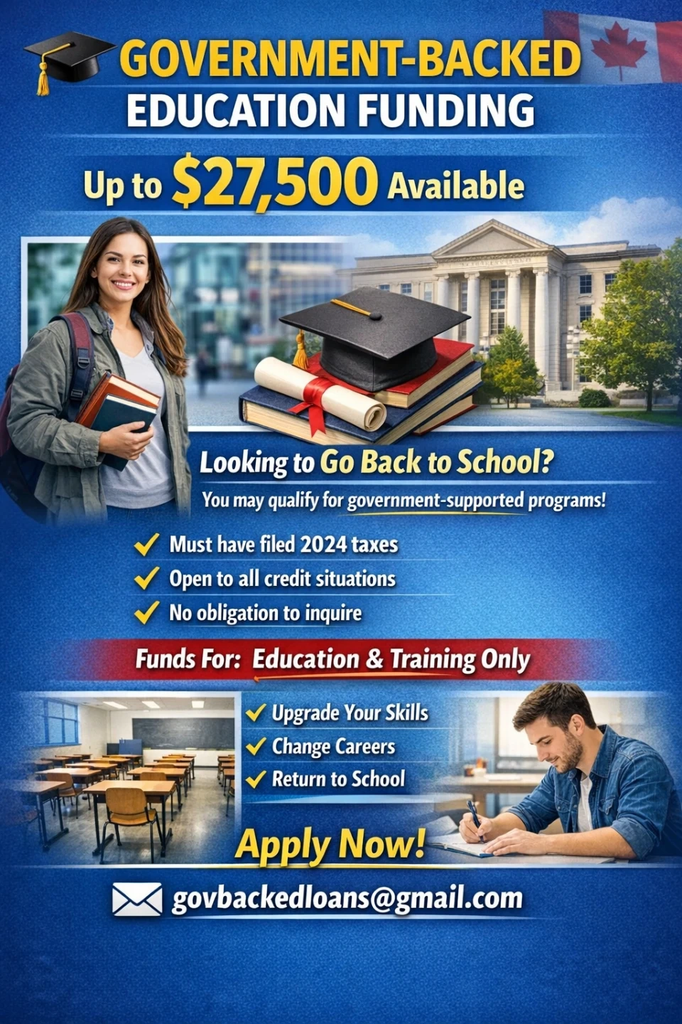 Looking to go back to school? You may qualify for government-supported programs! Funds are available for education and training only, including upgrading skills, changing careers, or returning to school. Must have filed 2024 taxes and open to all credit situations. Apply now!