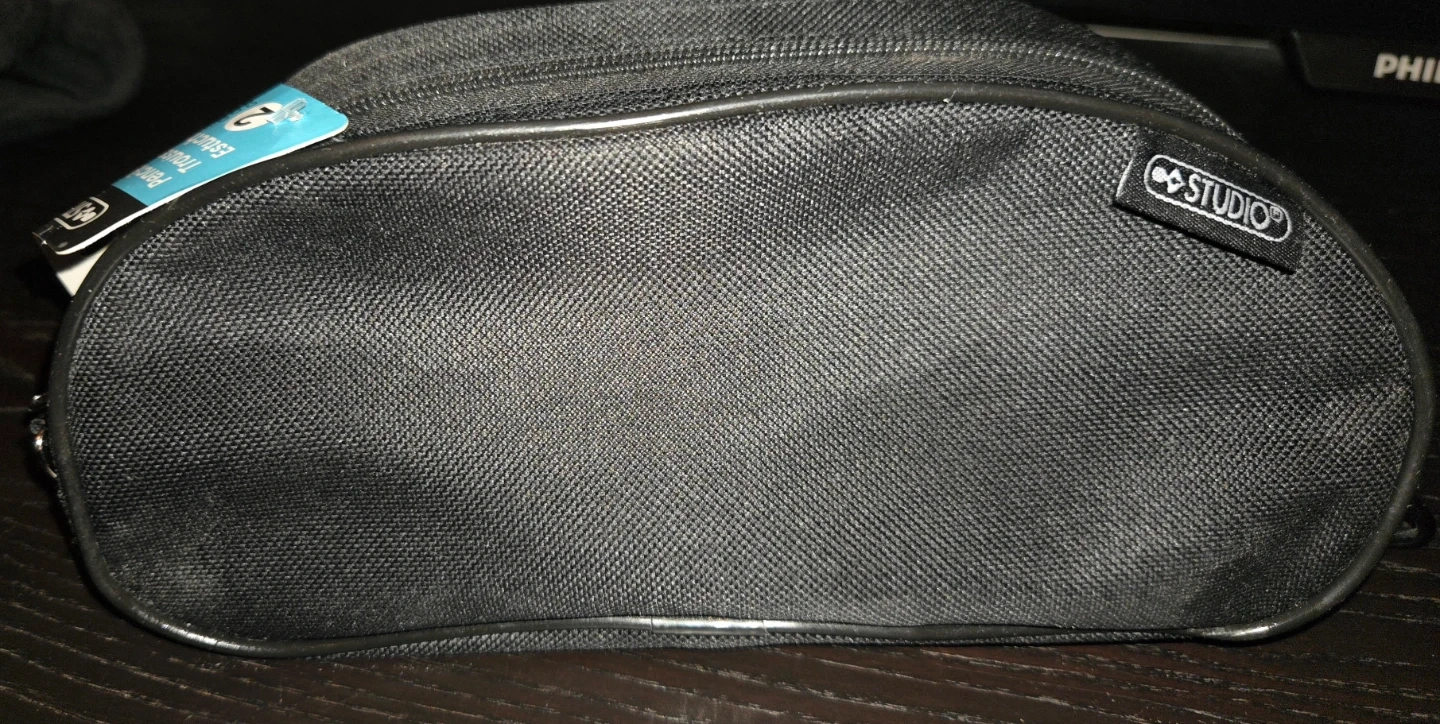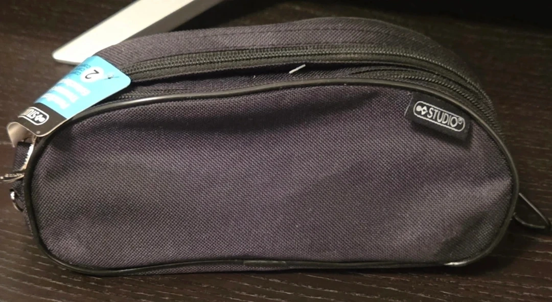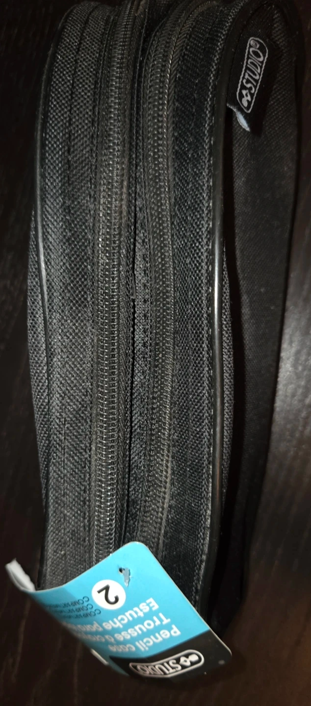 This STUDIO pencil case is black with two zippered compartments. It's a handy size for carrying pens and pencils. Suitable for students or artists on the go!