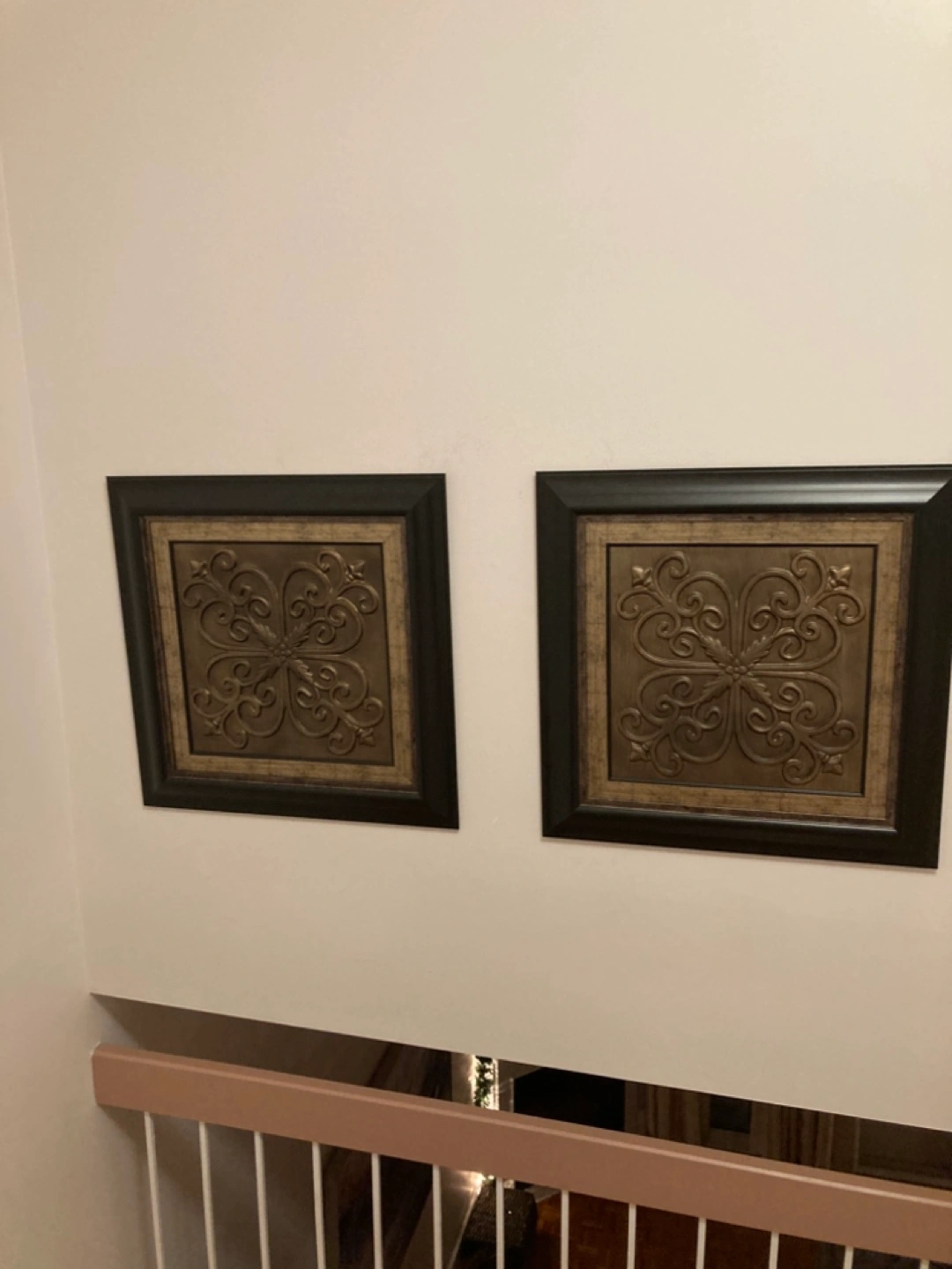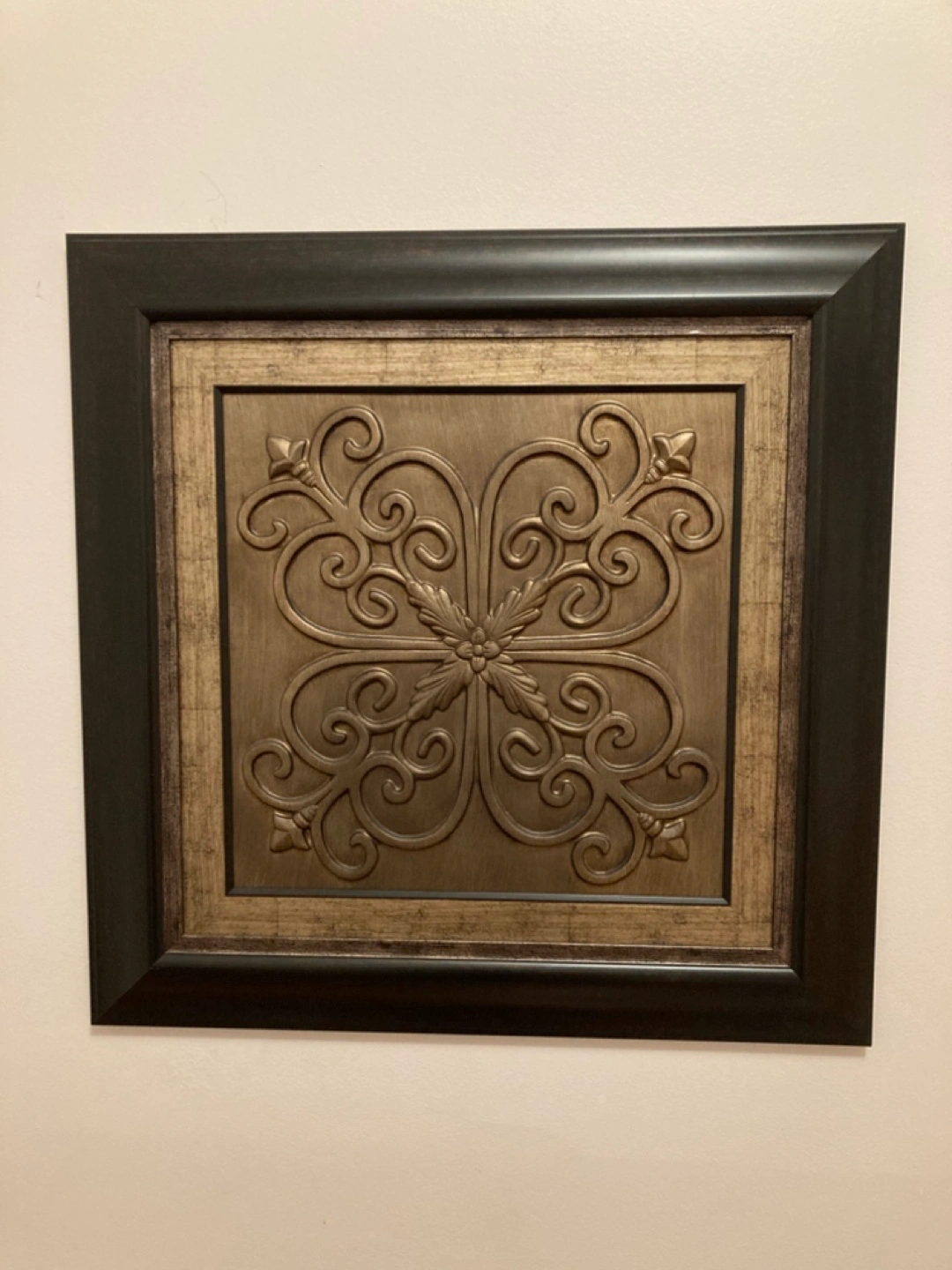 Two (metal looking)wall decor pieces with ornate designs in a dark brown frame.