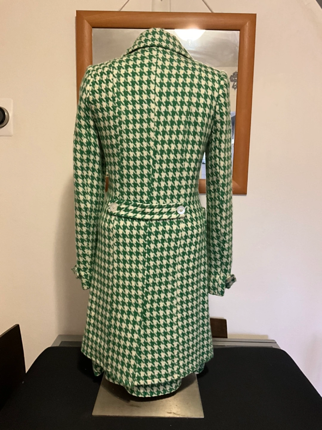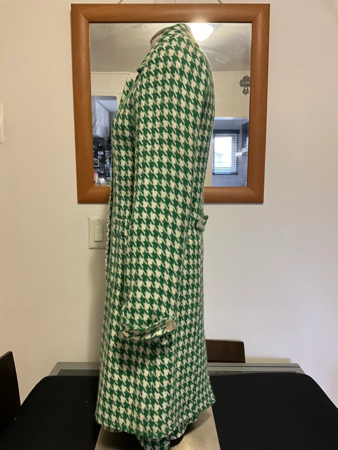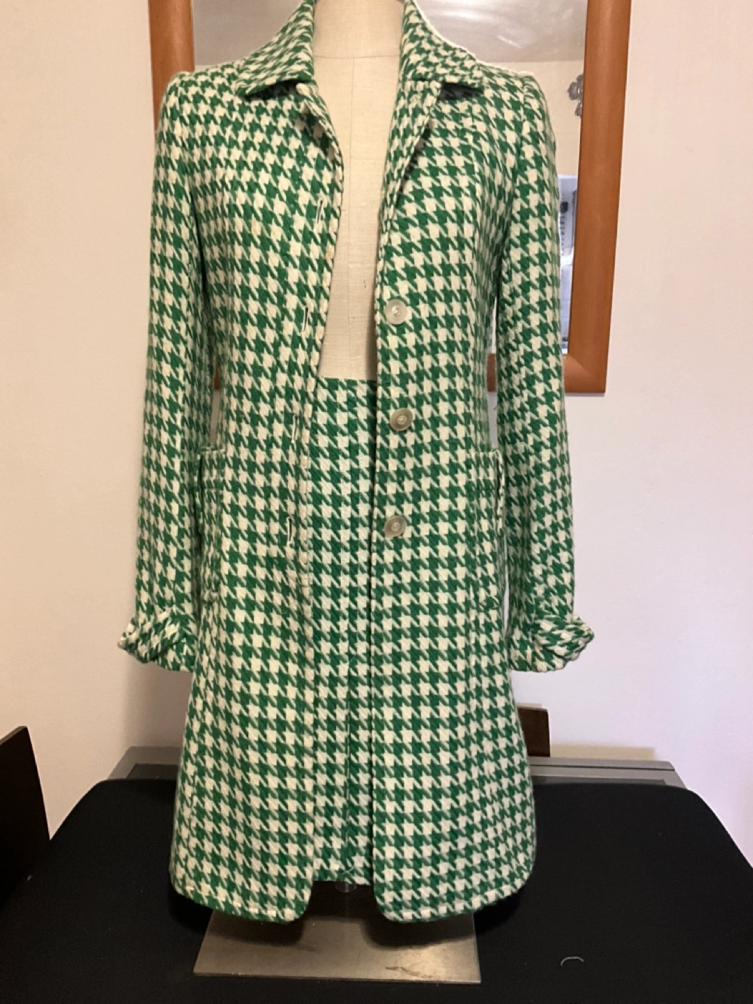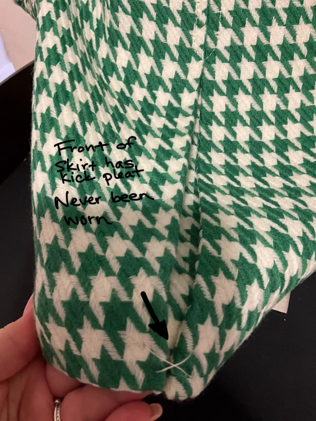 Matching skirt set and coat. Houndstooth pattern in green and white. Button up coat with pockets. Perfect for a formal spring day. Lining is shiny white polyester. Outfit is 50% Wool and 50% Acrylic. Super soft fabric. Skirt never worn and has a kick pleat in the front and yolk detail in the back. Excellent condition. Will consider Best Offer.