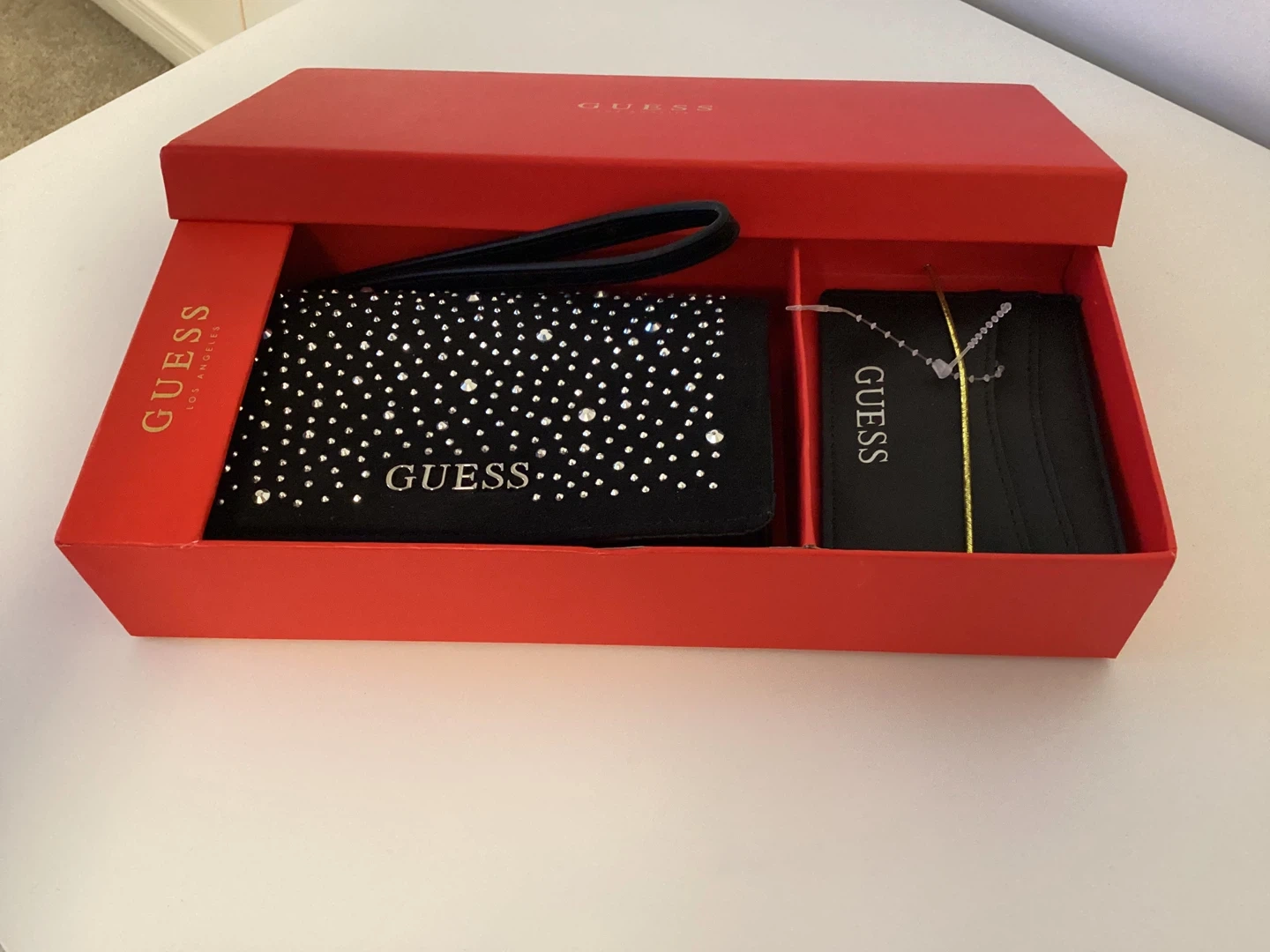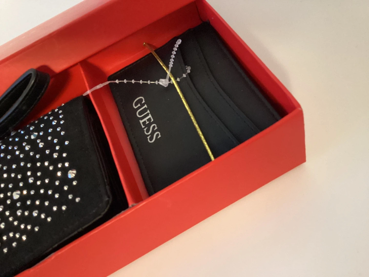 This Guess wallet set comes in black and includes a studded wallet with a wrist strap and a cardholder. Original price was $100