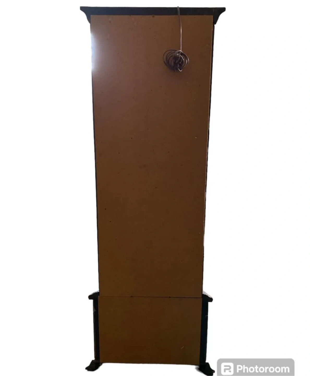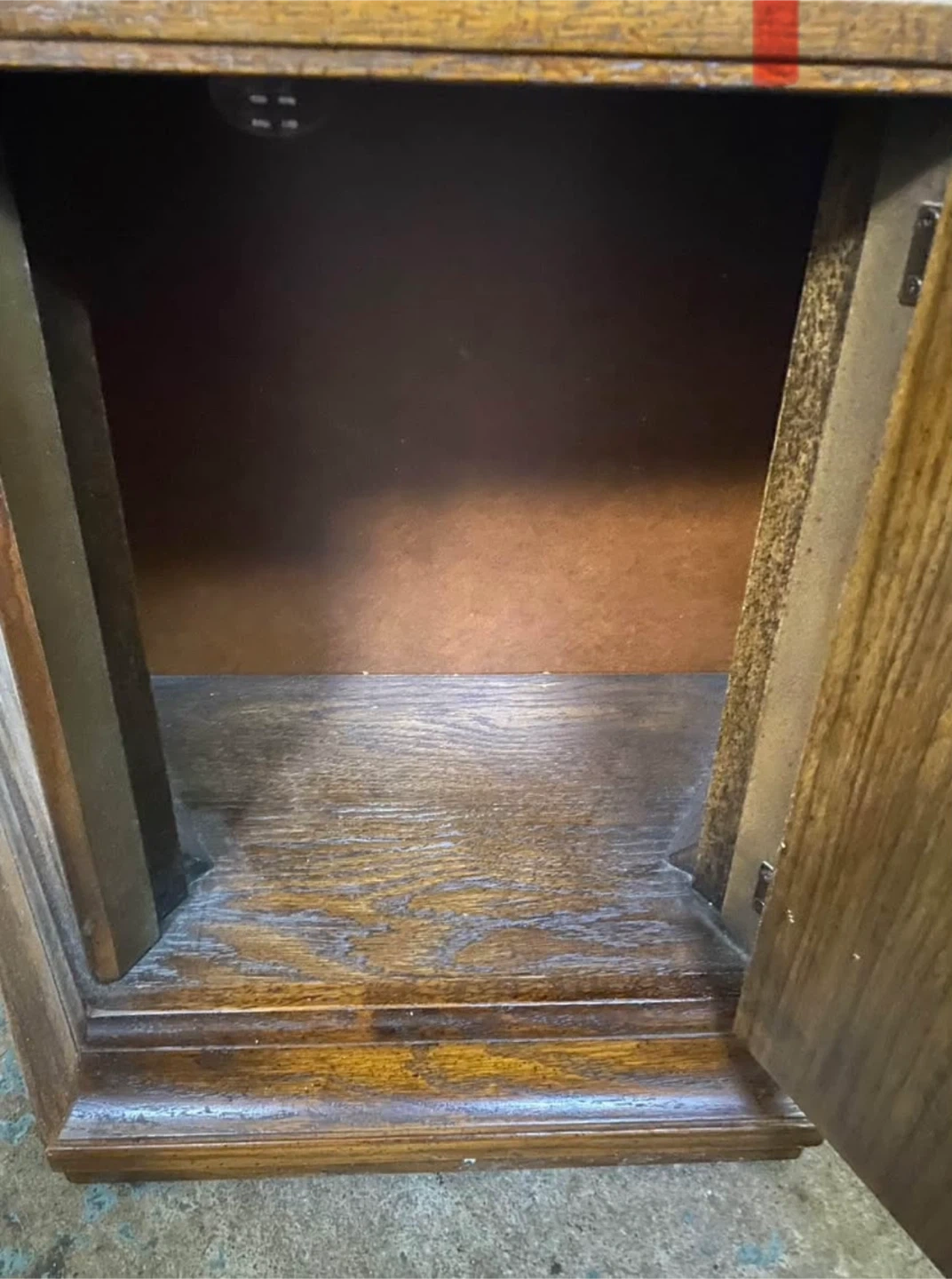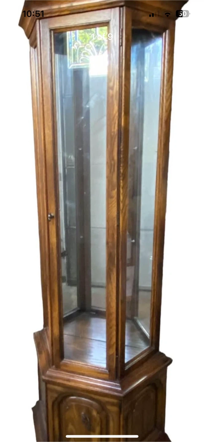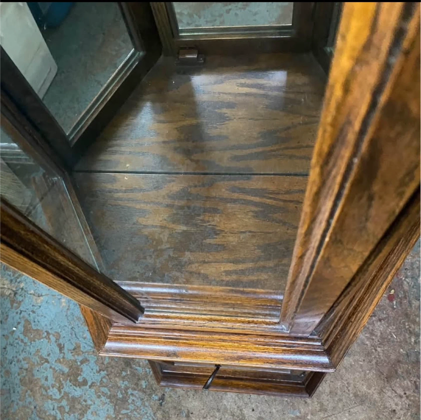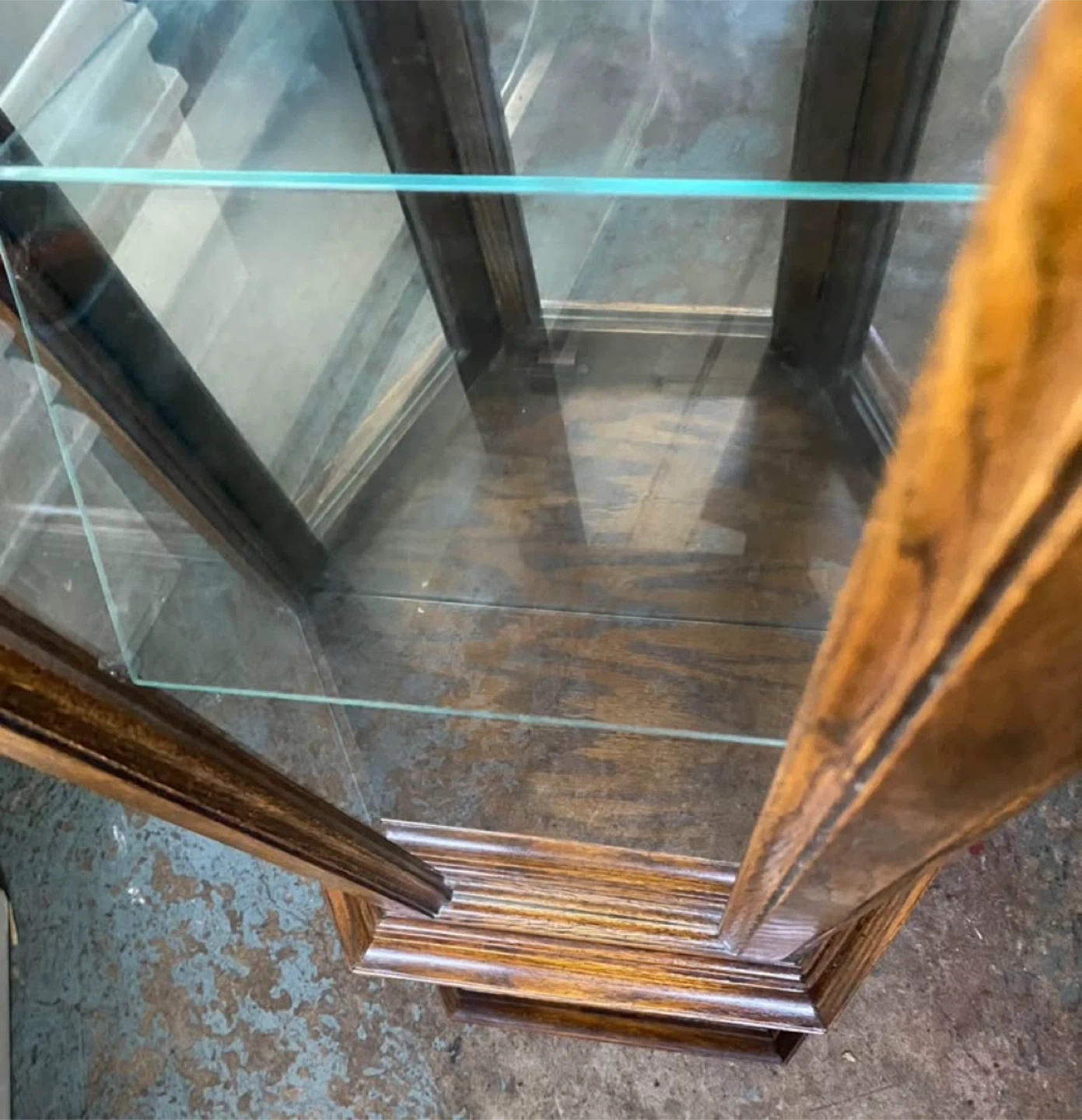 A lovely hexagonal display cabinet with glass doors. It's made of wood with a rich brown finish. Perfect for showcasing collectibles or decorative items!