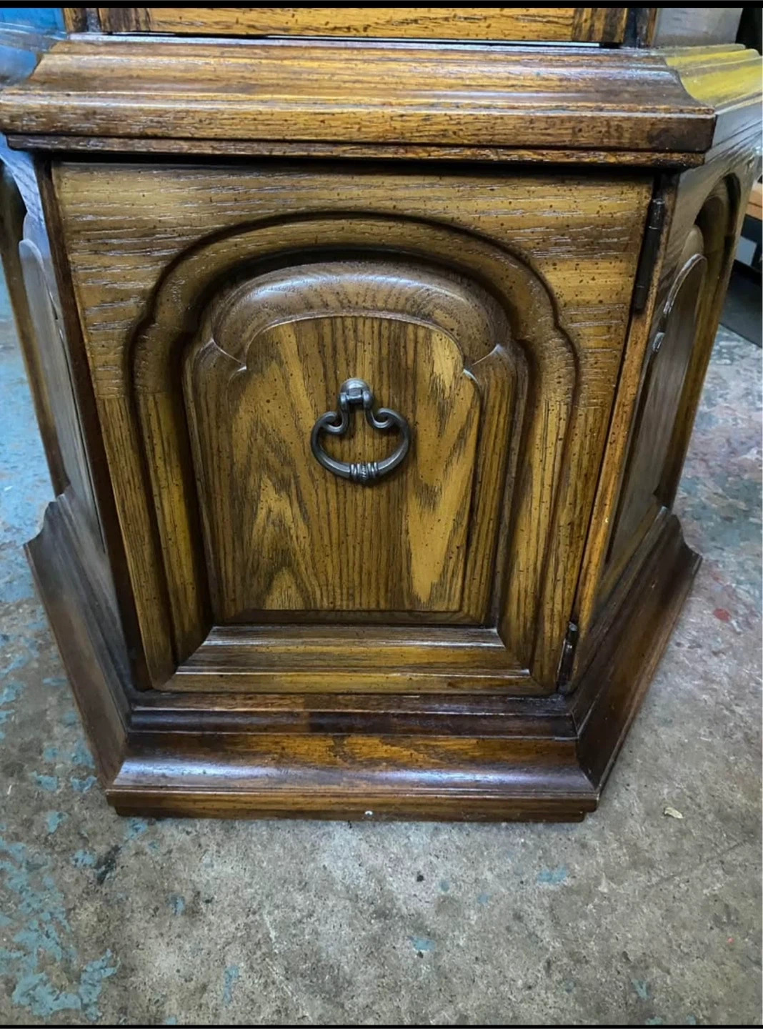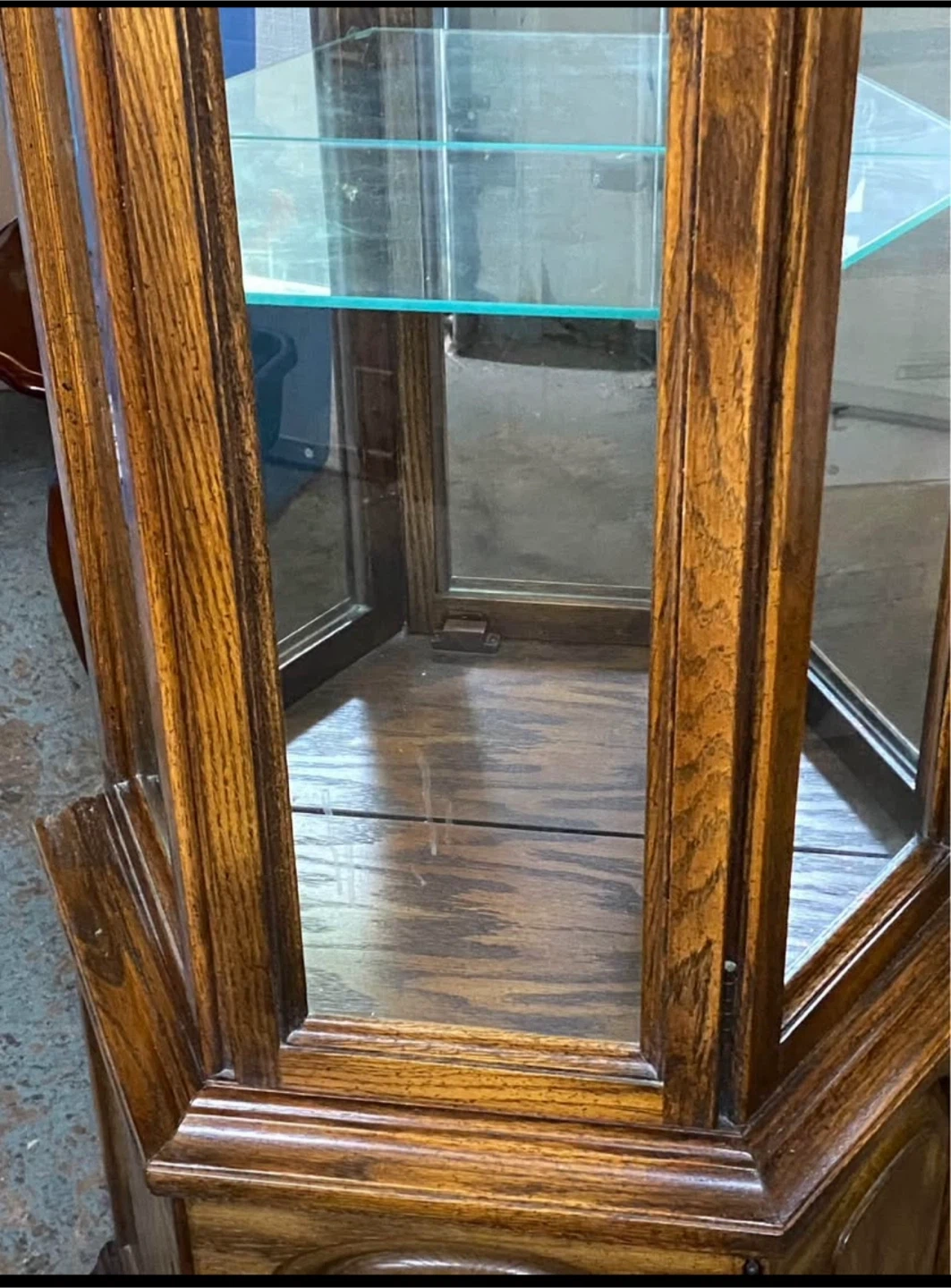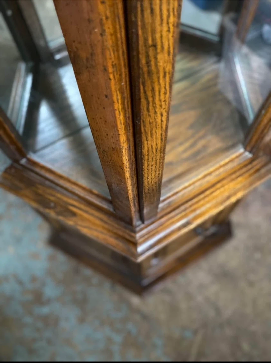 A lovely hexagonal display cabinet with glass doors. It's made of wood with a rich brown finish. Perfect for showcasing collectibles or decorative items!