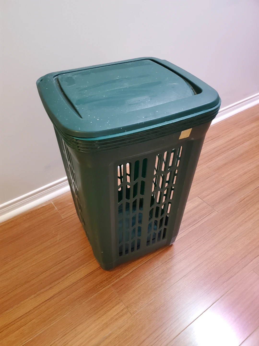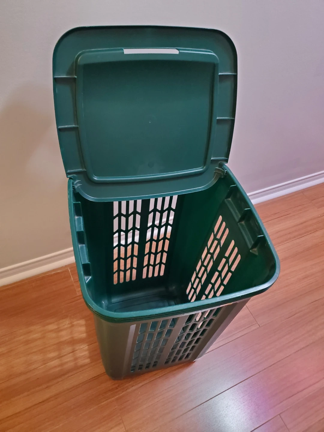 This dark green laundry hamper has a convenient lid to keep things tidy. It's made of durable plastic with ventilation holes. Perfect for sorting laundry or storing items!