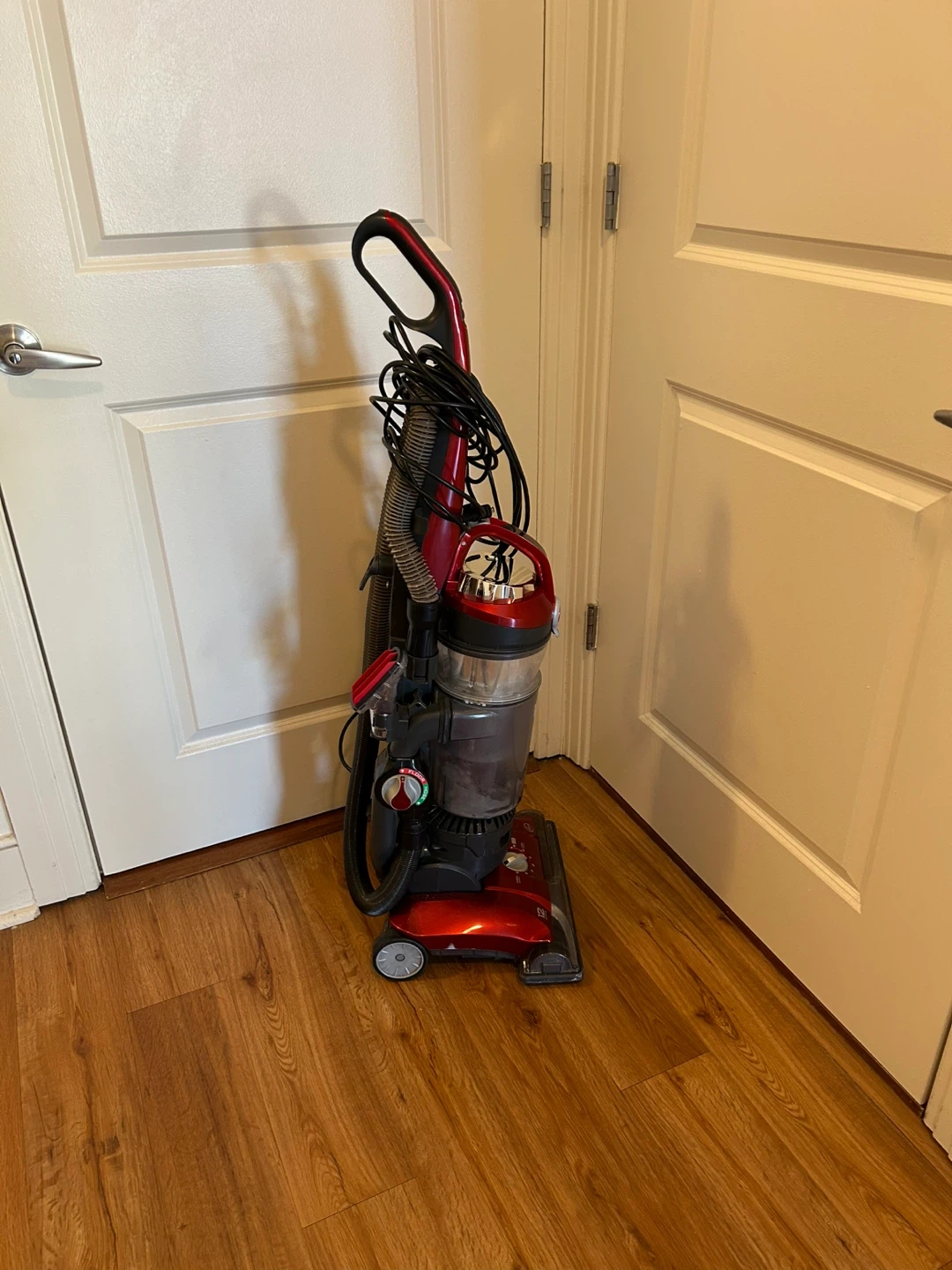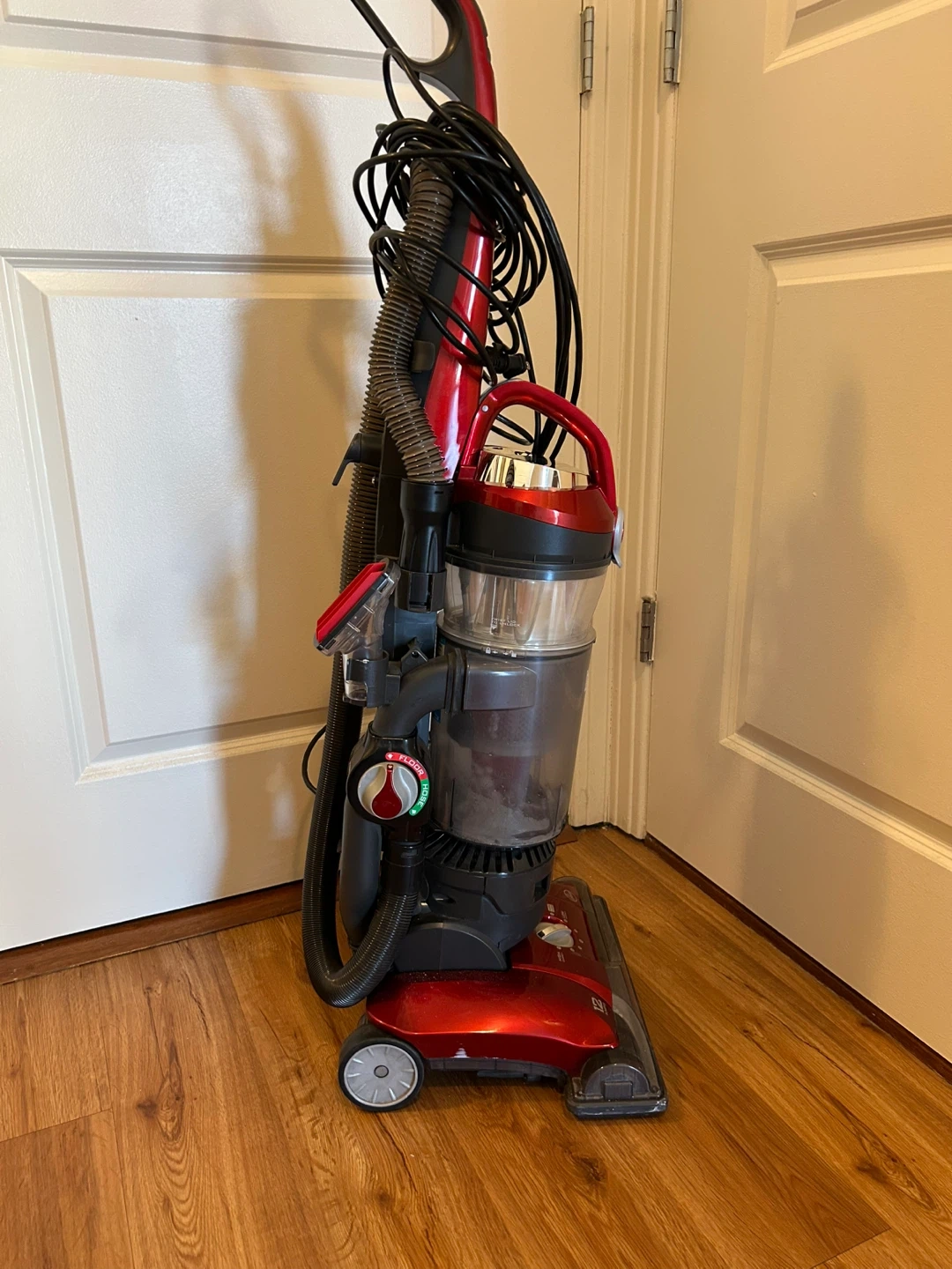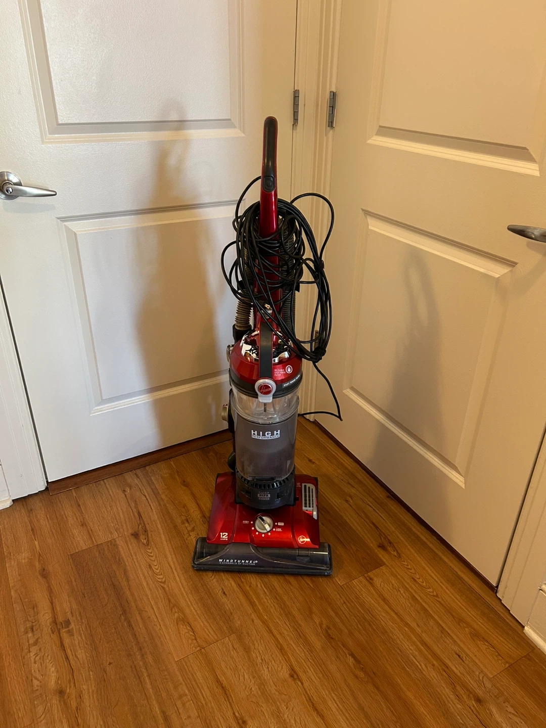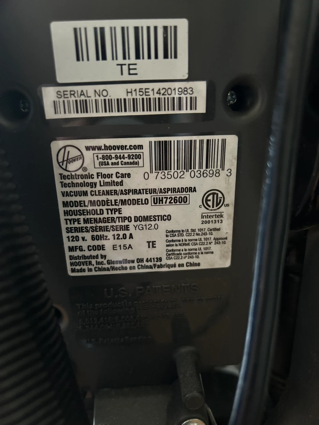 This is a red Hoover UH72600 Teenager Series bagless upright vacuum cleaner. It's designed for household use. It operates at 120V, 60Hz, 12.0A.