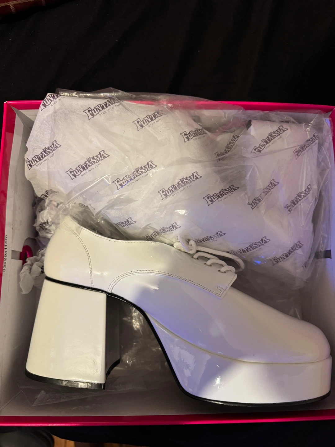 These Brand New Funtasma platform heels come in a shiny white patent material. They feature a chunky block heel and a round toe. The shoes are a US size L (equivalent to UK 12-13, EU 44-45, CM 30.6). Message me for more details, also check out the Page for more listings