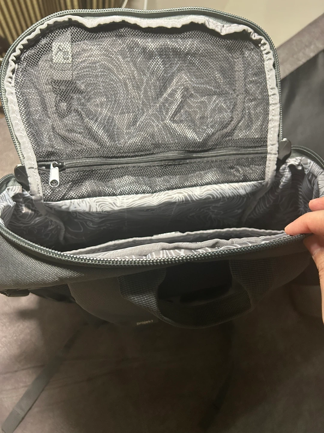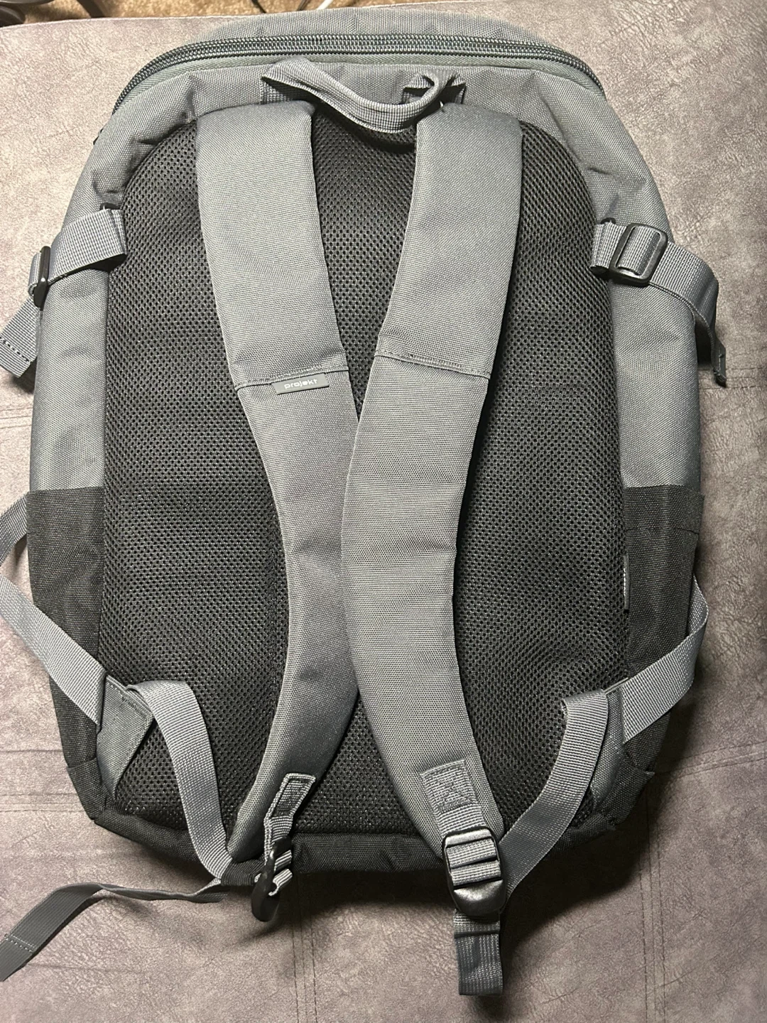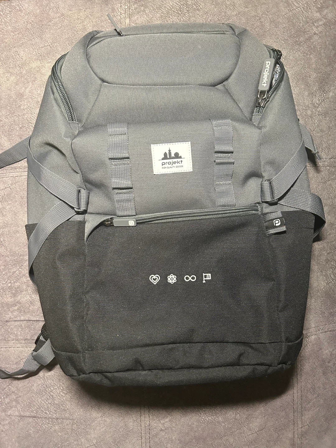 This Projekt backpack is grey and black. It has a padded back and adjustable shoulder straps for comfort. Multiple pockets and compartments offer ample storage space.