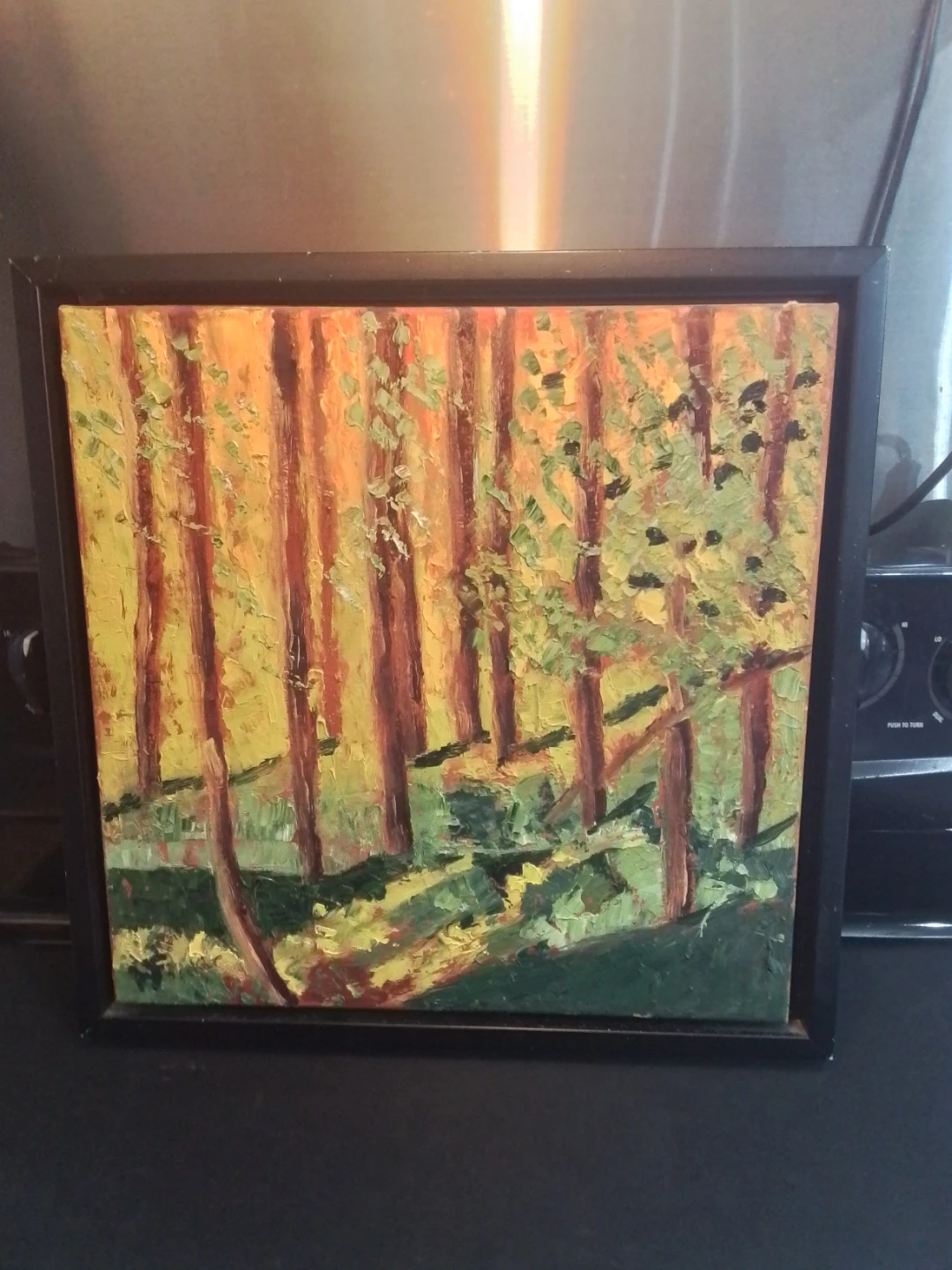 A textured oil painting depicting a forest scene with warm, dappled sunlight. It's framed in black, ready to hang. This piece adds a touch of nature's beauty to any room.