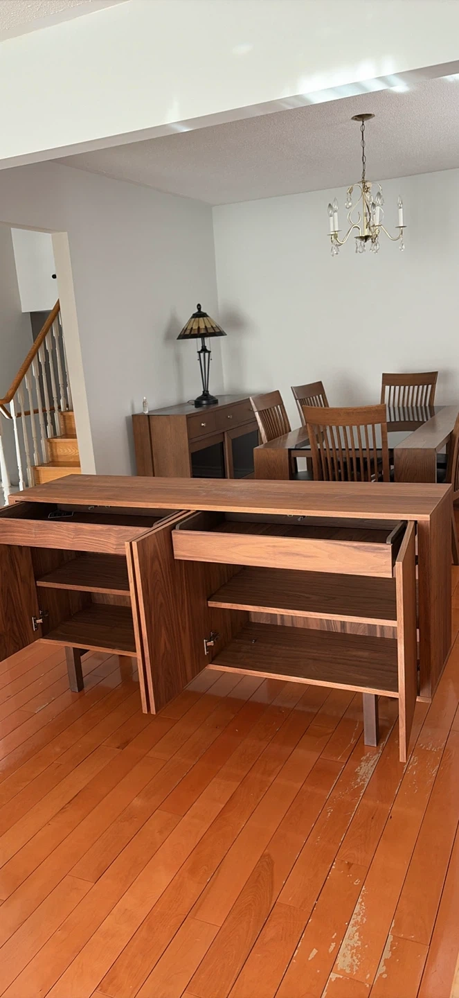 Stylish walnut credenza with four doors and interior shelving. It features a single drawer on the right side for extra storage. This piece offers ample space for dining room or living room essentials.