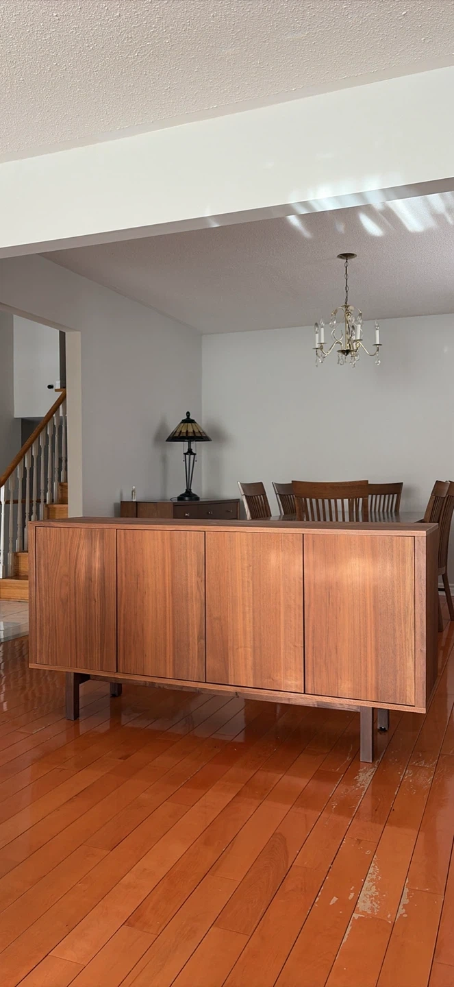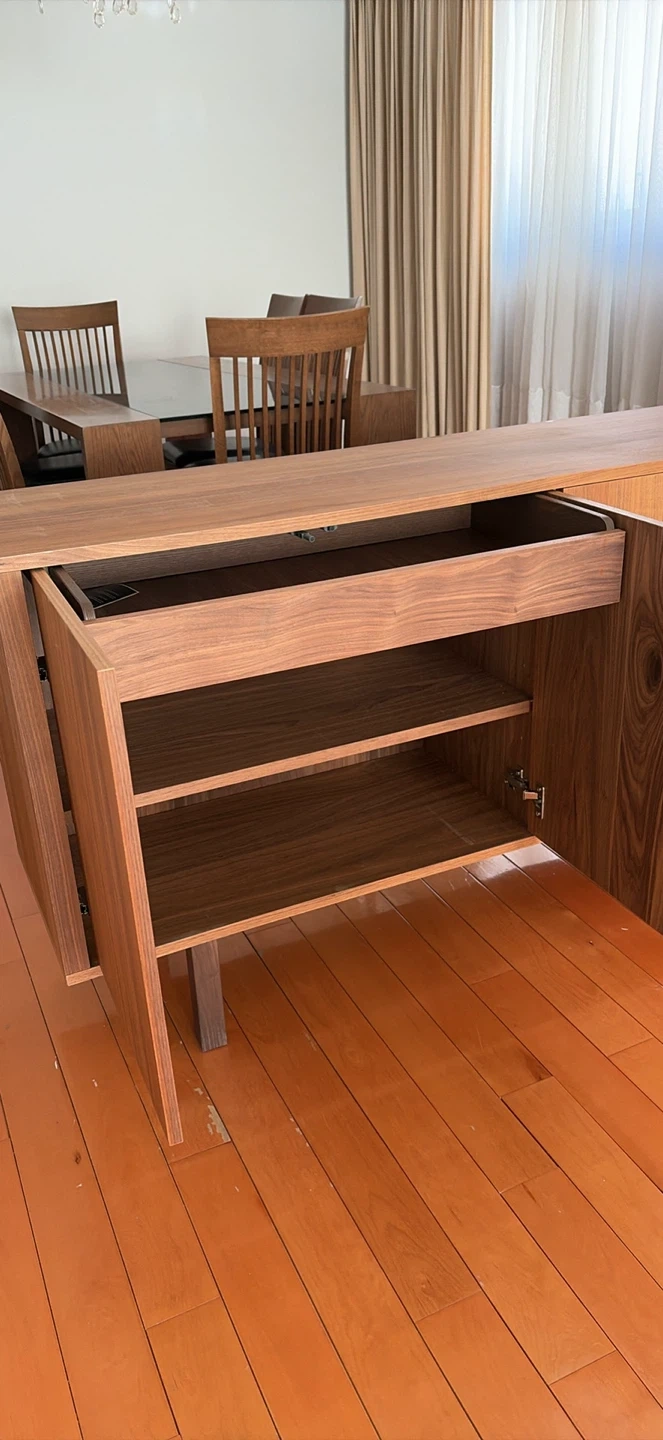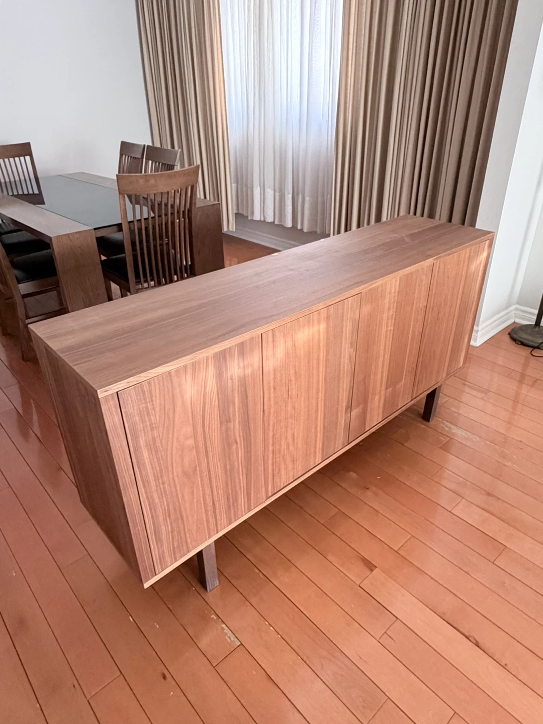 Stylish walnut credenza with four doors and interior shelving. It features a single drawer on the right side for extra storage. This piece offers ample space for dining room or living room essentials.