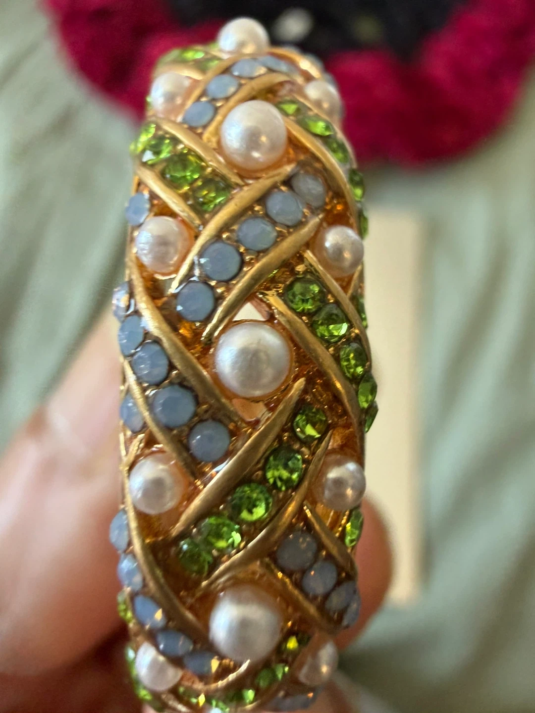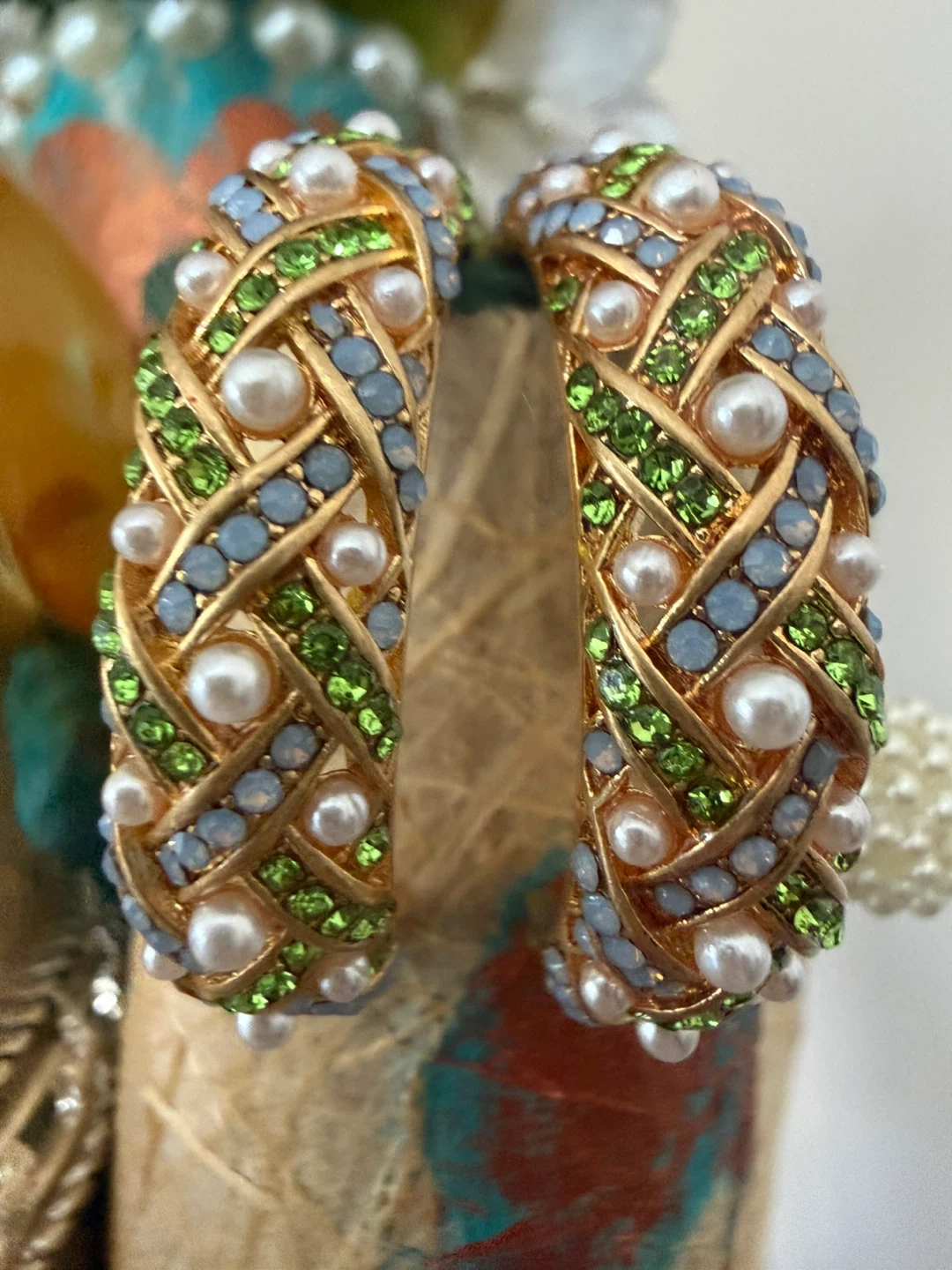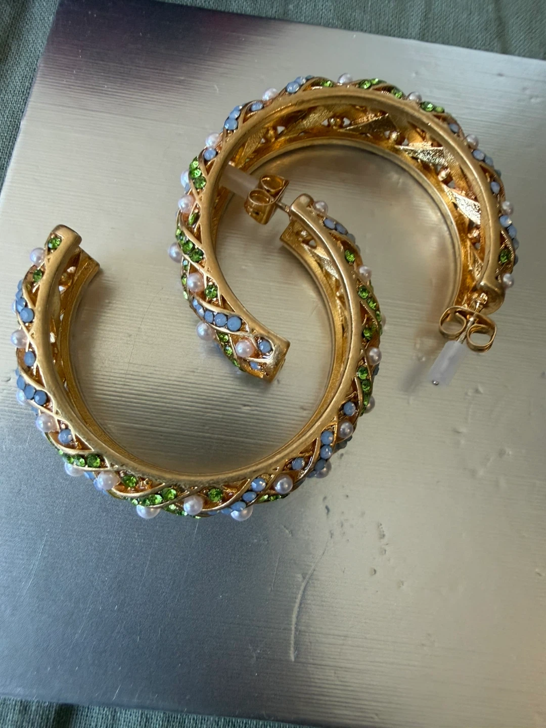 These are a pair of gold-tone hoop earrings. They're adorned with faux pearls and sparkly green and blue crystals in a woven design. These earrings add a touch of elegance to any outfit!