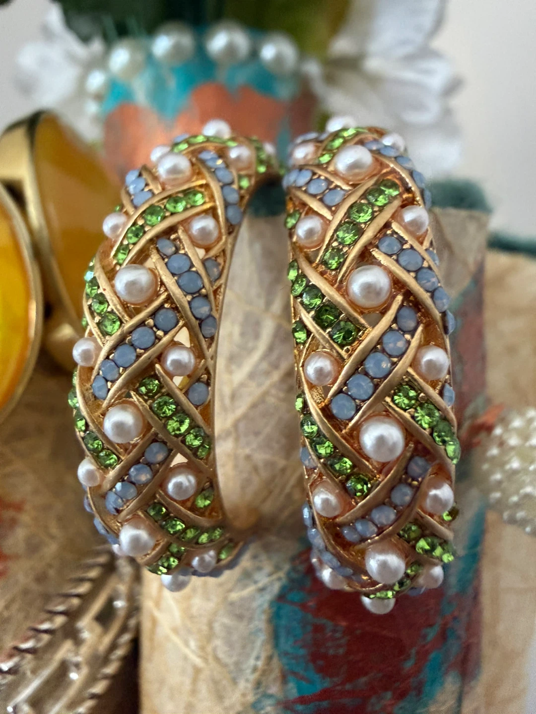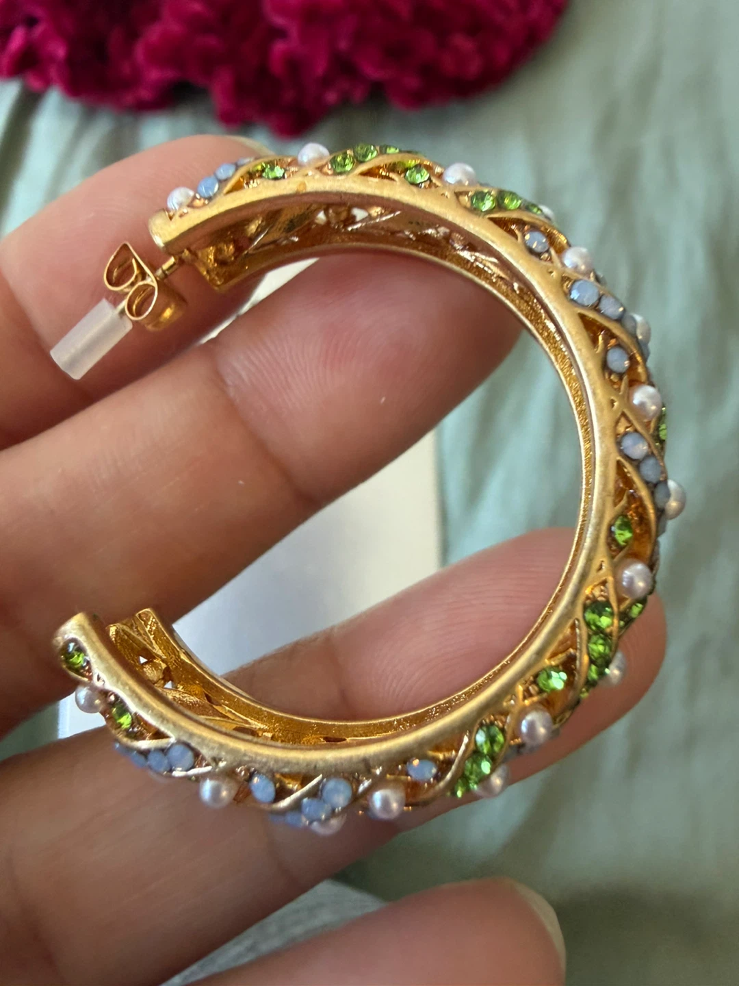 These are a pair of gold-tone hoop earrings. They're adorned with faux pearls and sparkly green and blue crystals in a woven design. These earrings add a touch of elegance to any outfit!