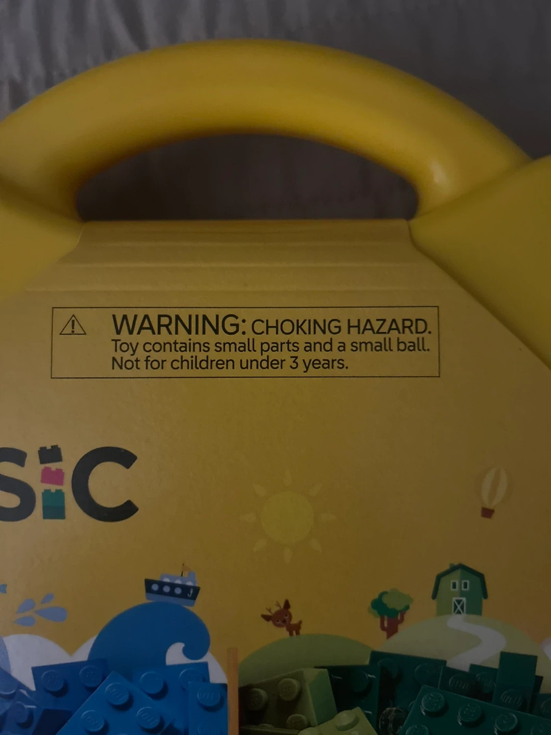 This is a LEGO Classic Creative Suitcase with 213 pieces. It's a building toy designed for ages 4-99. The suitcase is yellow and includes various coloured bricks for creative building.