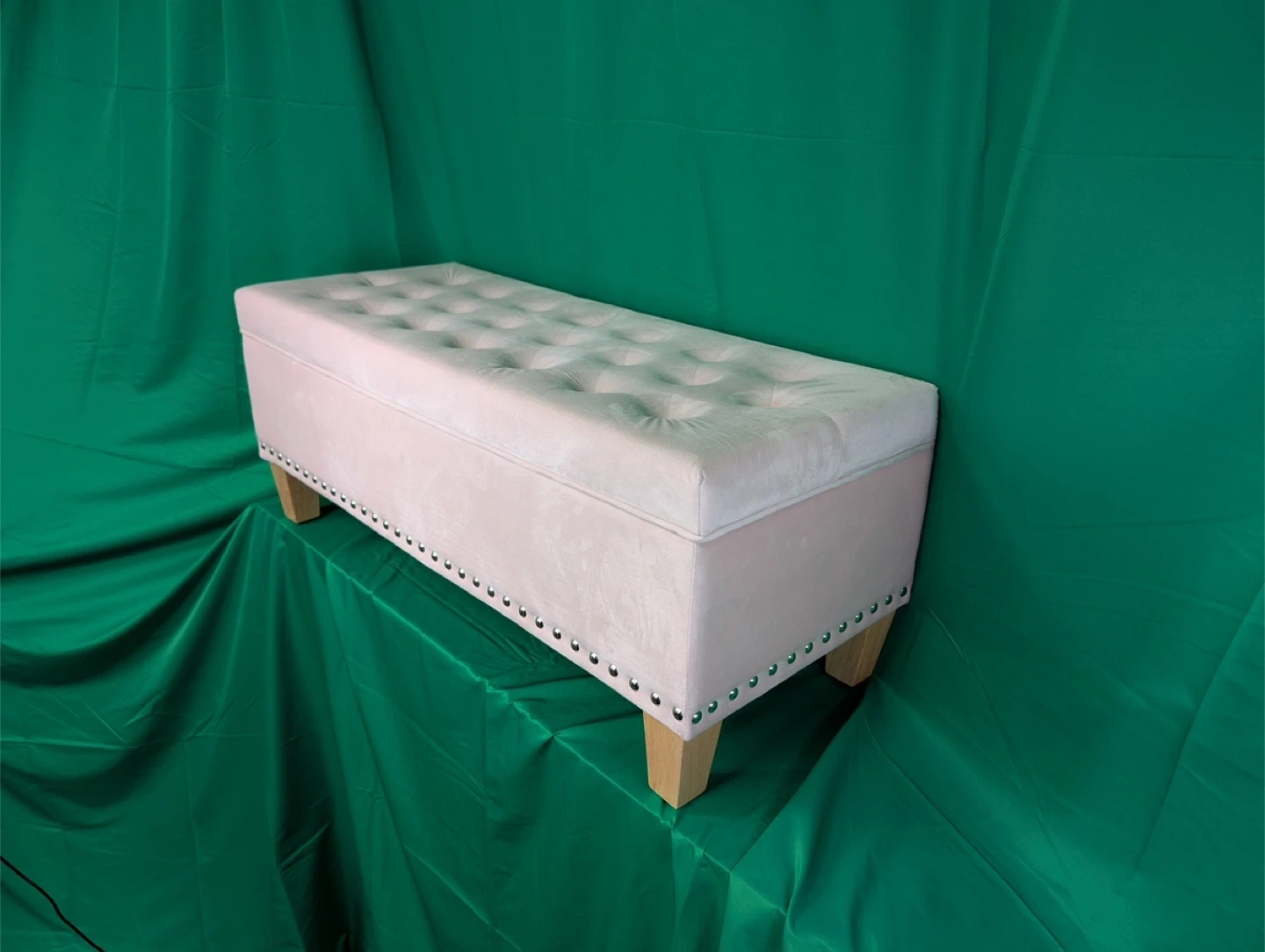 Gorgeous blush-pink ottoman with crystal button tufting, nailhead trim, and solid wood legs.