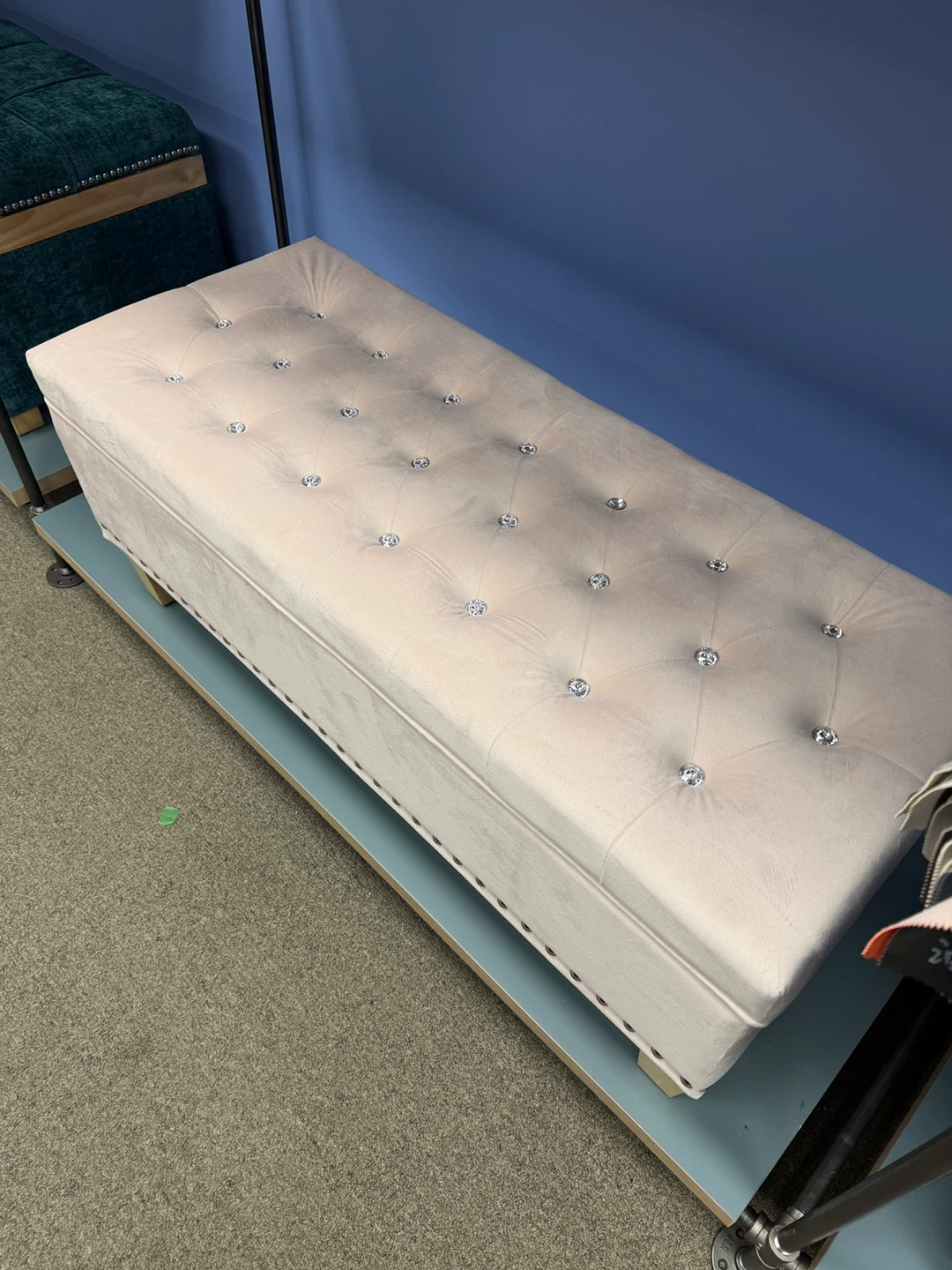 Gorgeous blush-pink ottoman with crystal button tufting, nailhead trim, and solid wood legs.