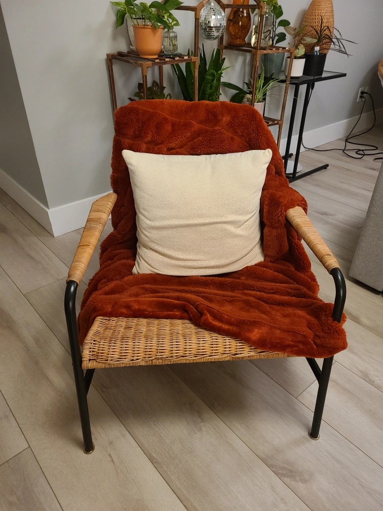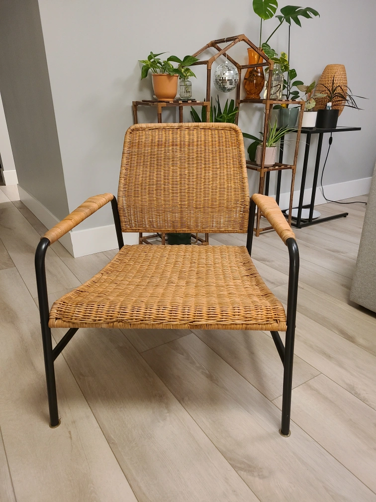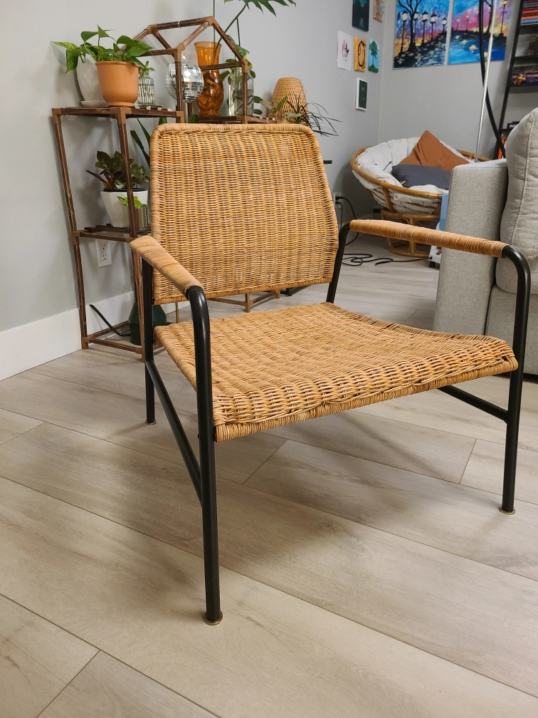 Selling a wicker armchair with a black metal frame. It's a stylish piece that would look great in any living room or sunroom. The wicker seat and back are in good condition, and the black metal frame is sturdy and supportive. Perfect for adding a touch of natural texture to your home!