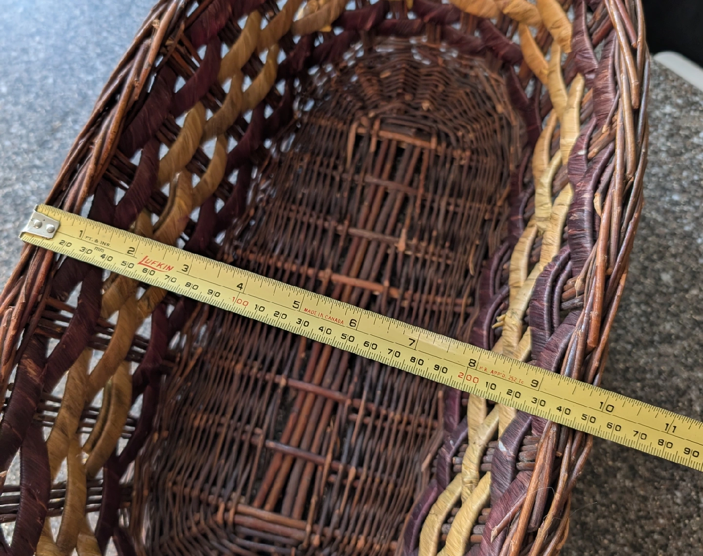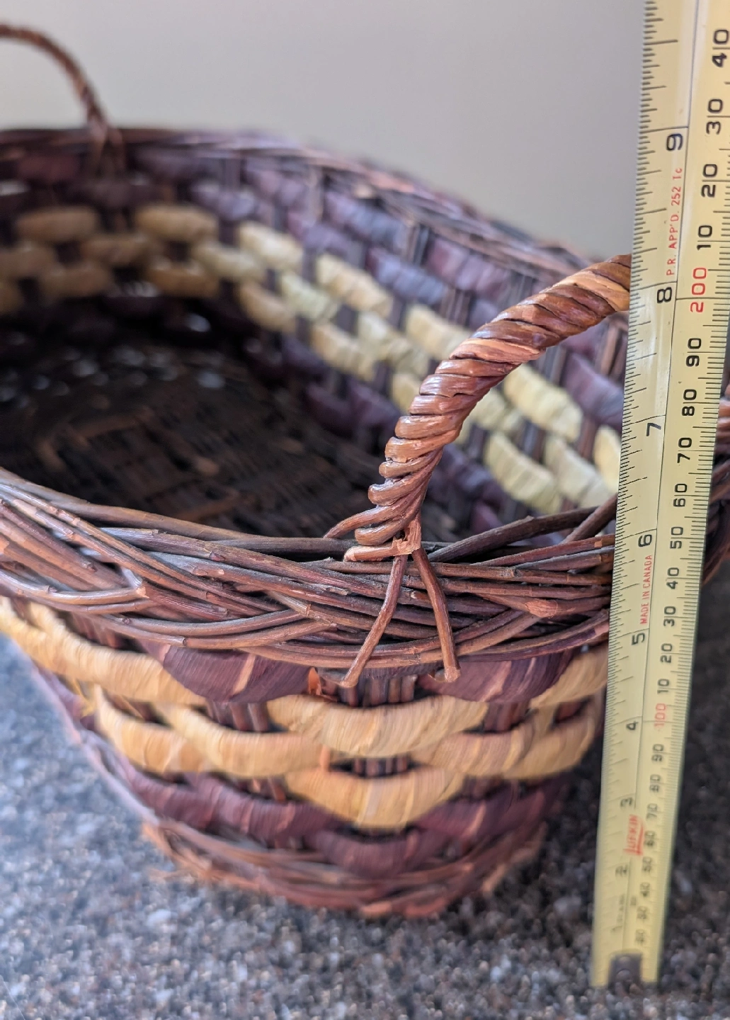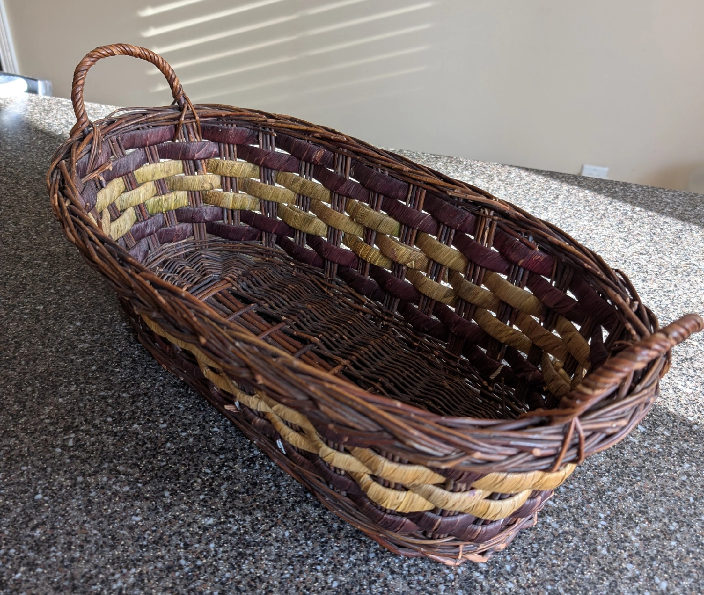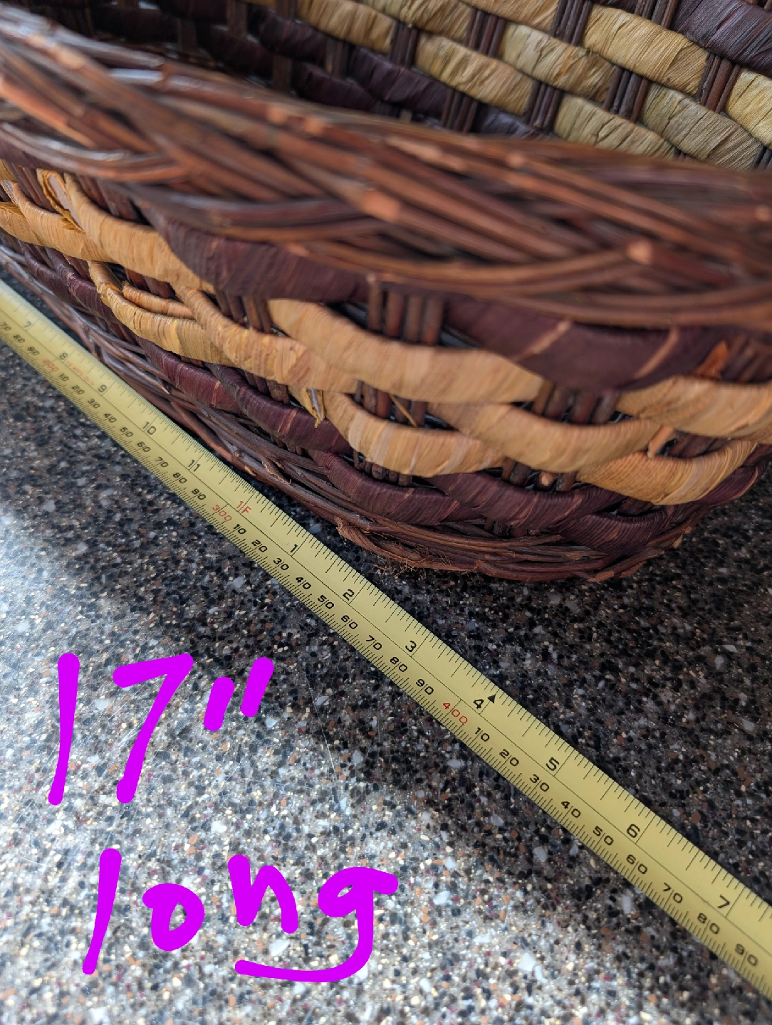 Selling a sturdy wicker basket in good condition! It's a lovely brown and beige (pale greenish?) colour, and measures 17 inches long. It would be perfect for storage or decor. Makes a great landing pad at a front entrance.