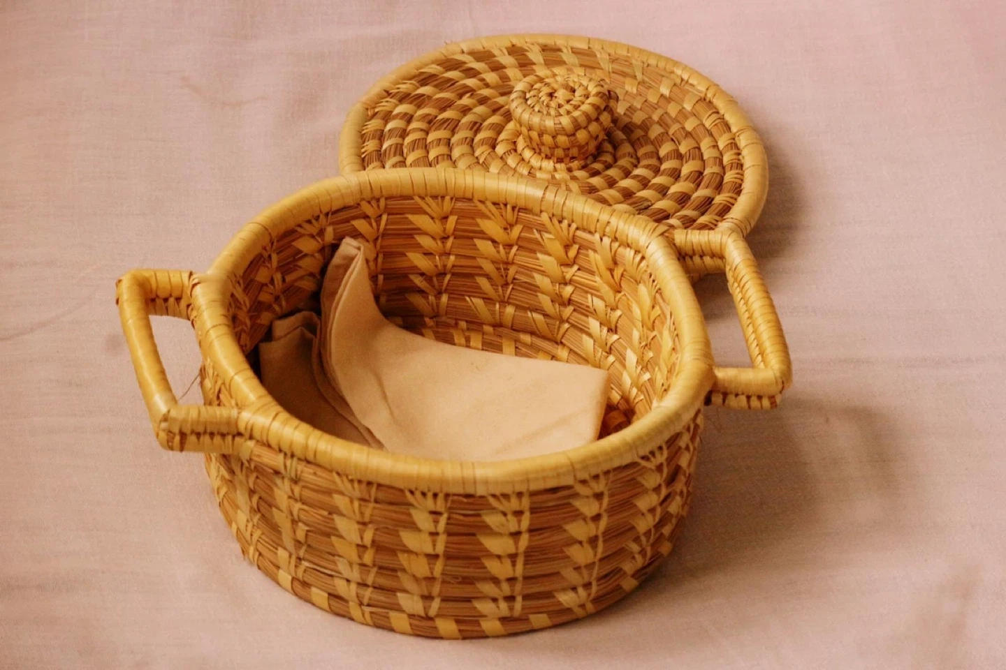 This is a charming wicker basket with a lid, perfect for storage or decoration! It has a natural, woven texture and a convenient handle design. It's in great condition and ready for a new home! perfect for roti/Bread Basket Storage Box