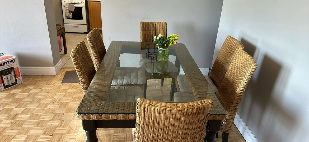 A beautiful wicker dining table with 6 chairs and a glass top. Cane, wood and glass used to make this elegant and cool urban uplift to your dining space. Offer on only till it is picked by a beautiful family.