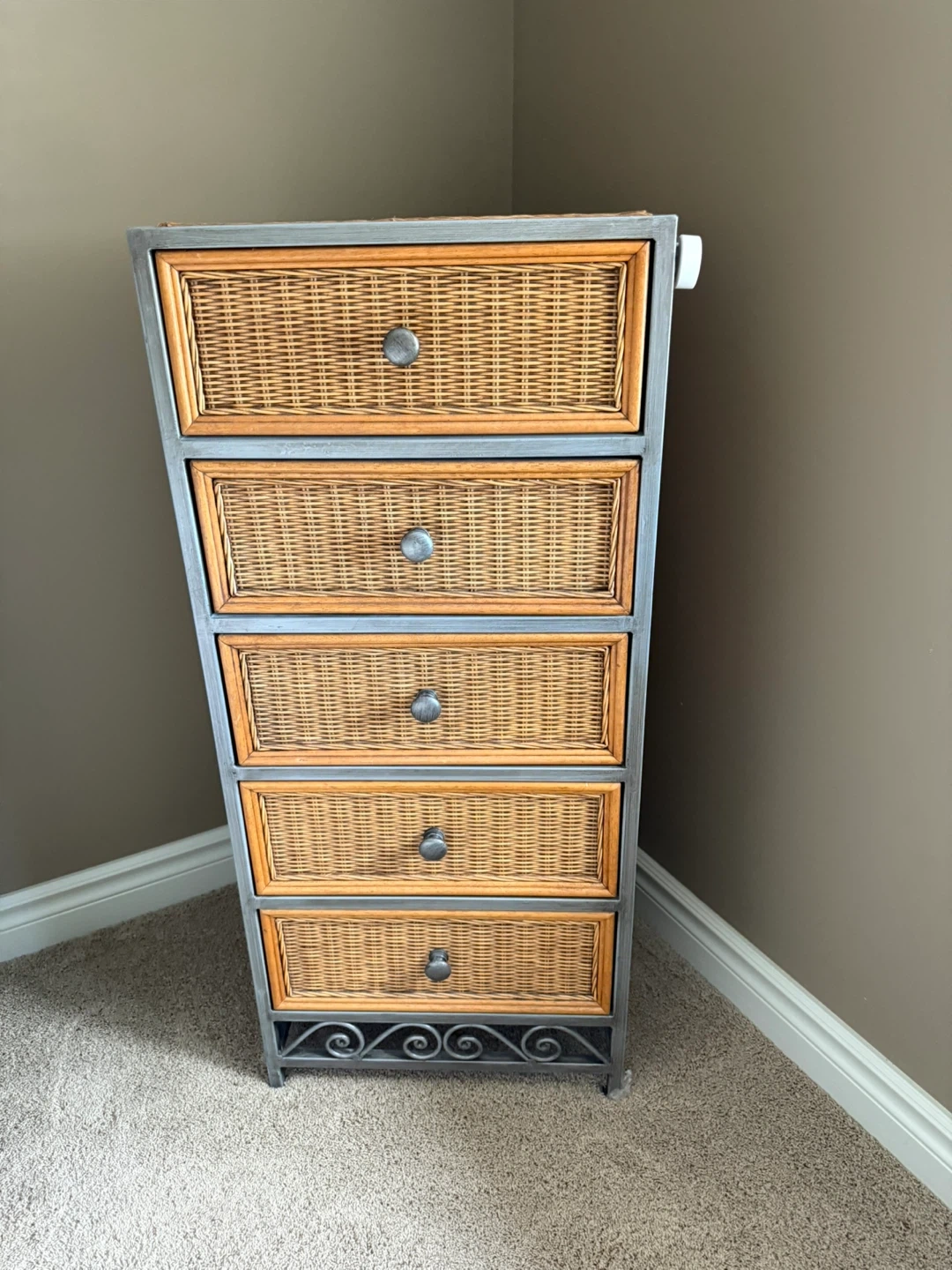 10Here's a cute wicker drawer storage tower! It features five drawers, each with wicker fronts and metal pulls. The frame is a sturdy metal with decorative scrollwork at the base. Perfect for adding some extra storage with a touch of rustic charm to any room