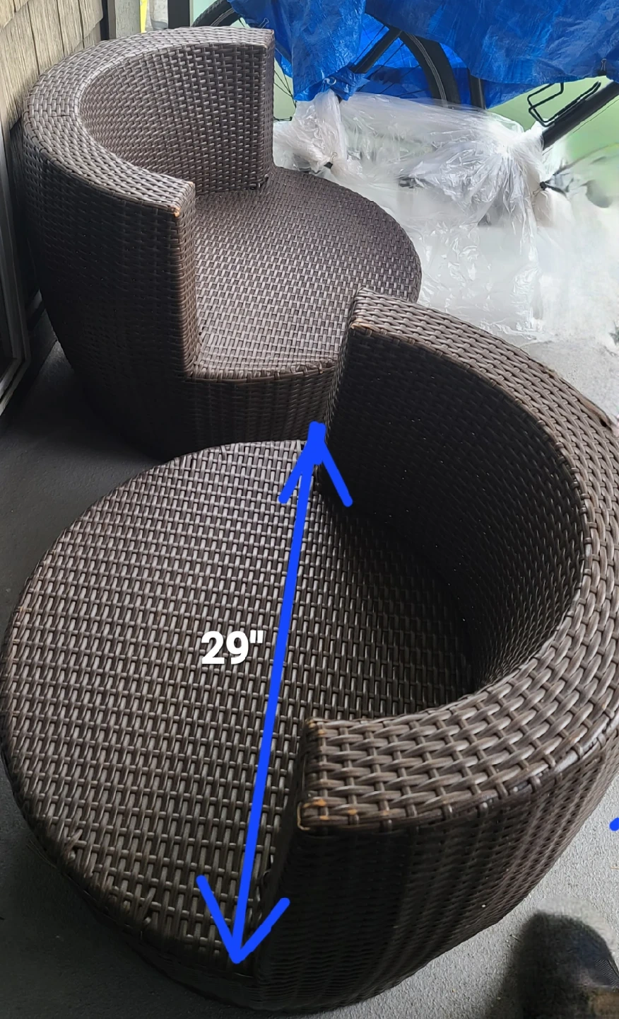 10Indoor / Outdoor Chair set – Stackable, Stylish & Comfortable *Upgrade your patio/ indoor space game with this pair of ultra-chic, space-saving wicker chairs that do it all – lounge like royalty or stack them up like a modern art sculpture when not in use! What You Get: *2x Stylish semi-circle rattan chairs *Cozy, contemporary, and curve-hugging design *Stackable – Yes, they fit together like furniture Tetris (see pics)! *Perfect for patios, balconies, or indoor chill spots *Pickup from Lower Lonsdale