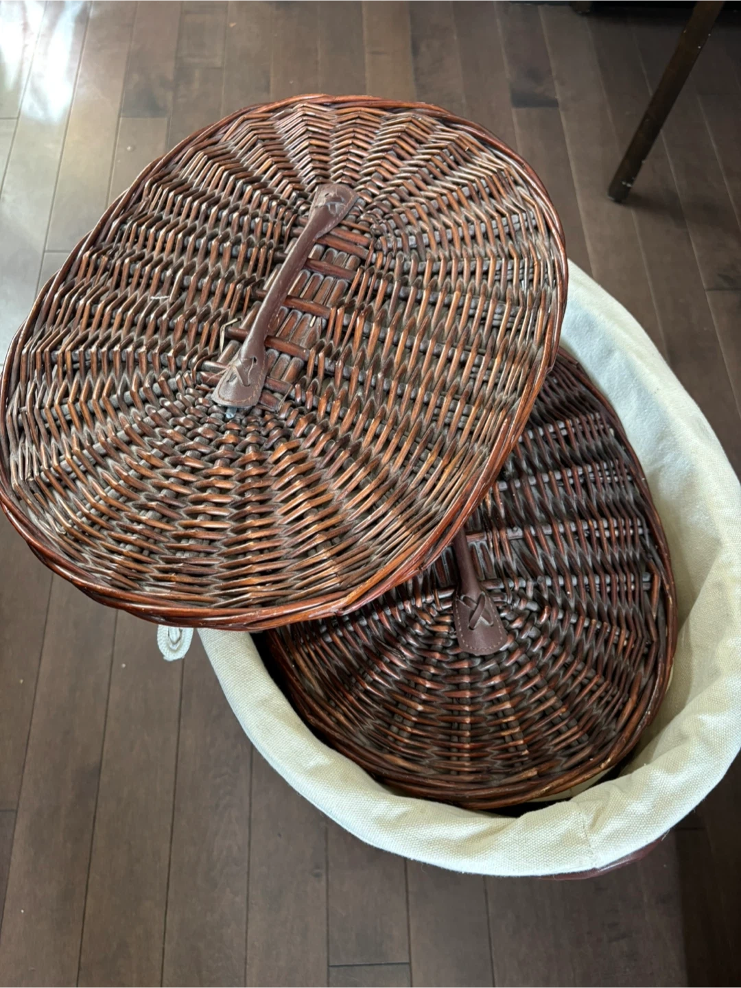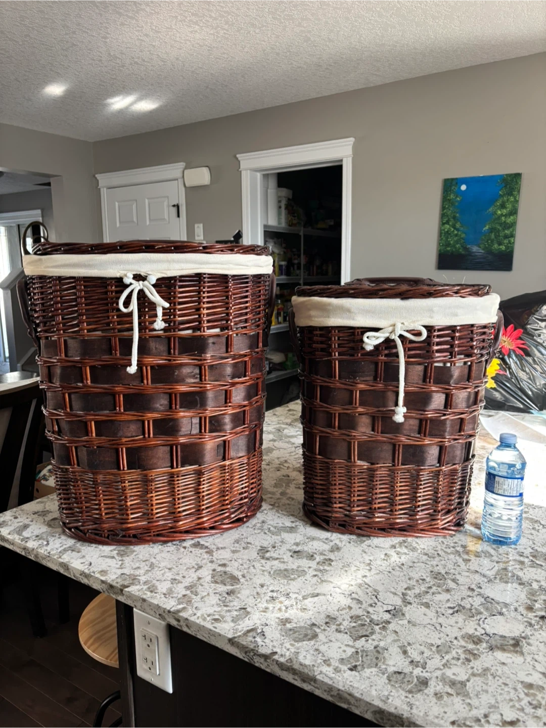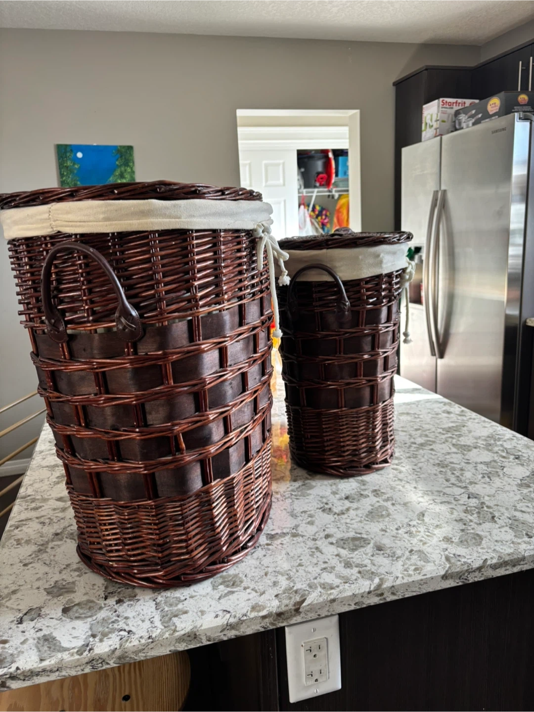 213Selling a set of two wicker laundry baskets. They come with removable cloth liners and lids. Great for adding a rustic touch to your laundry room or bedroom! The baskets are in good condition and ready for a new home