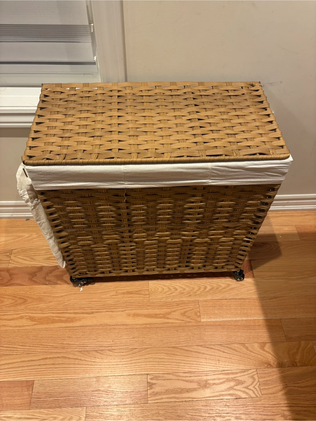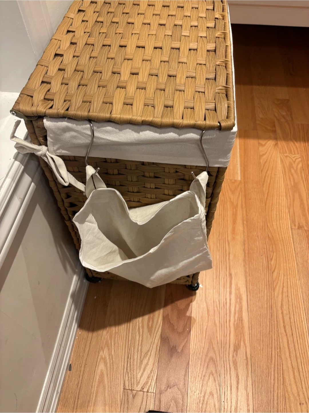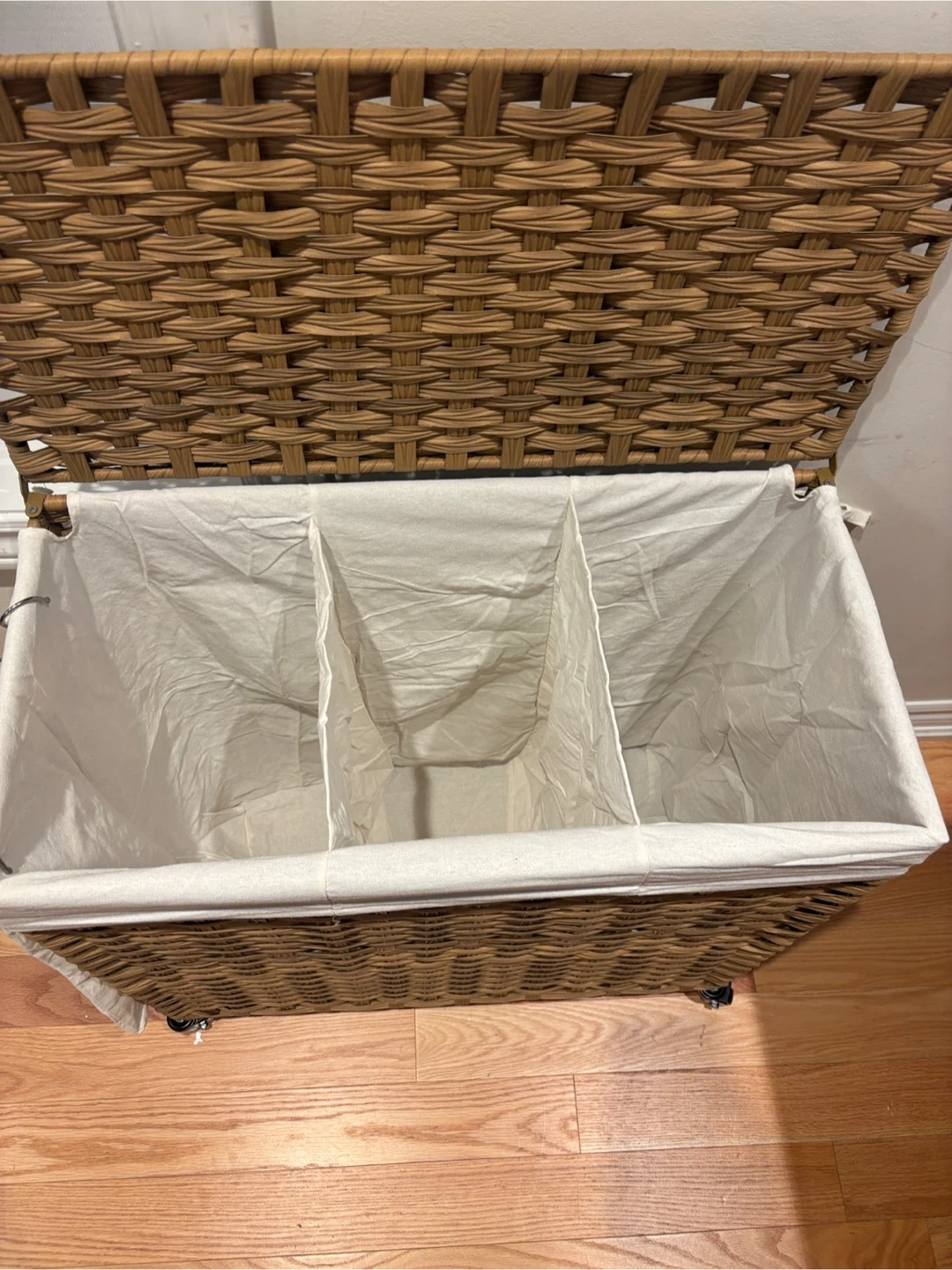 202This is a wicker laundry hamper with three compartments, perfect for sorting your clothes! It has a lid and a removable liner, and it's on wheels for easy transport. The hamper is ready for a new home