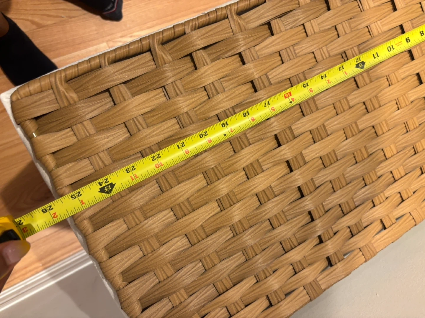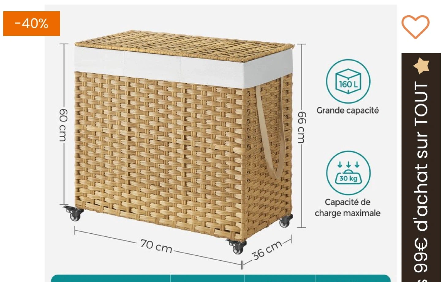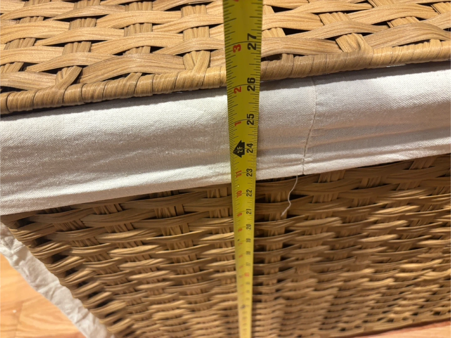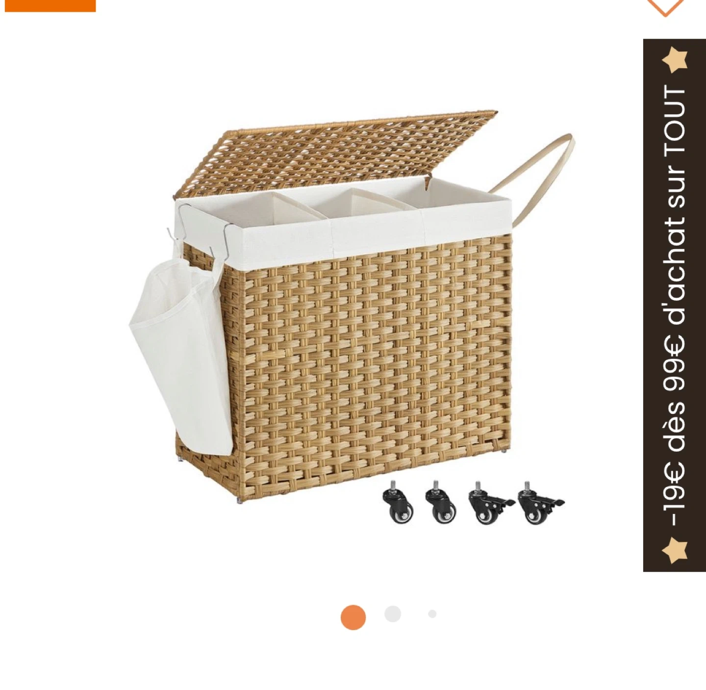 202This is a wicker laundry hamper with three compartments, perfect for sorting your clothes! It has a lid and a removable liner, and it's on wheels for easy transport. The hamper is ready for a new home