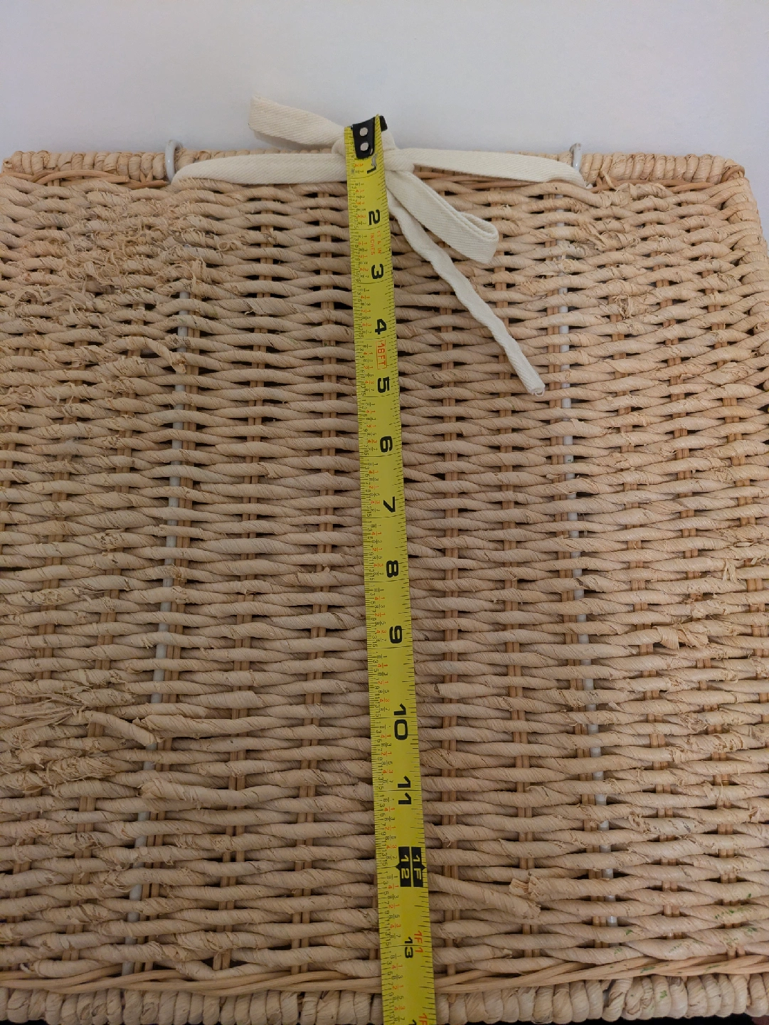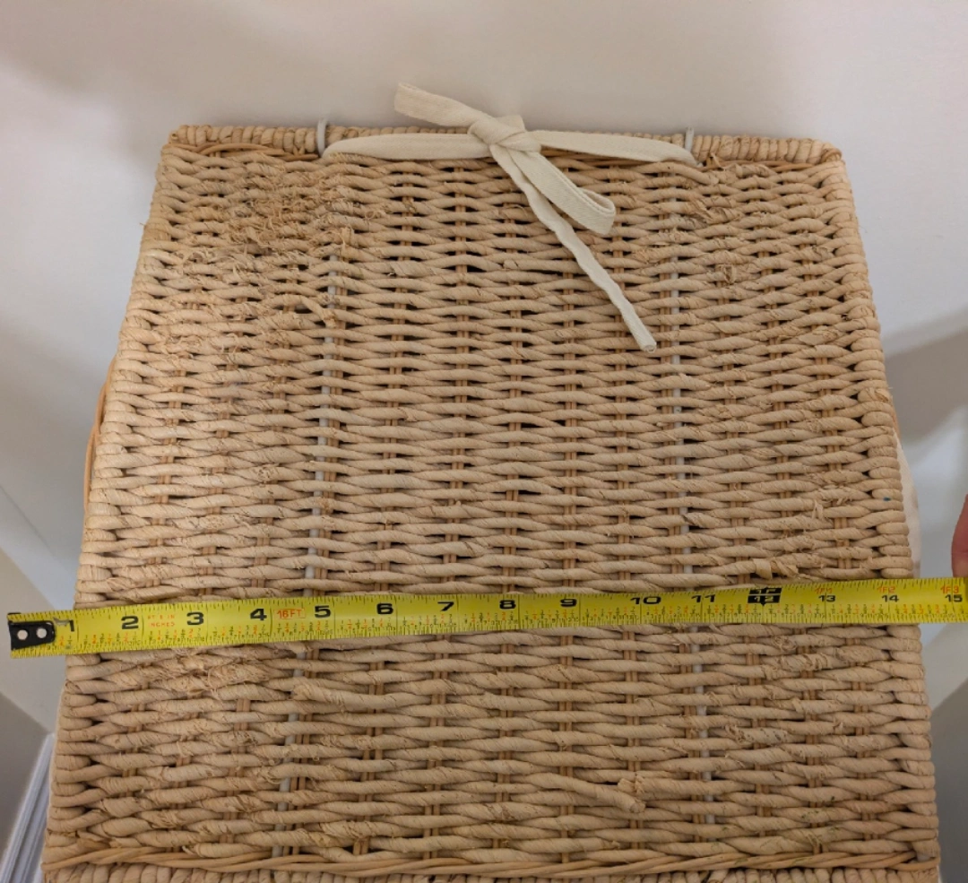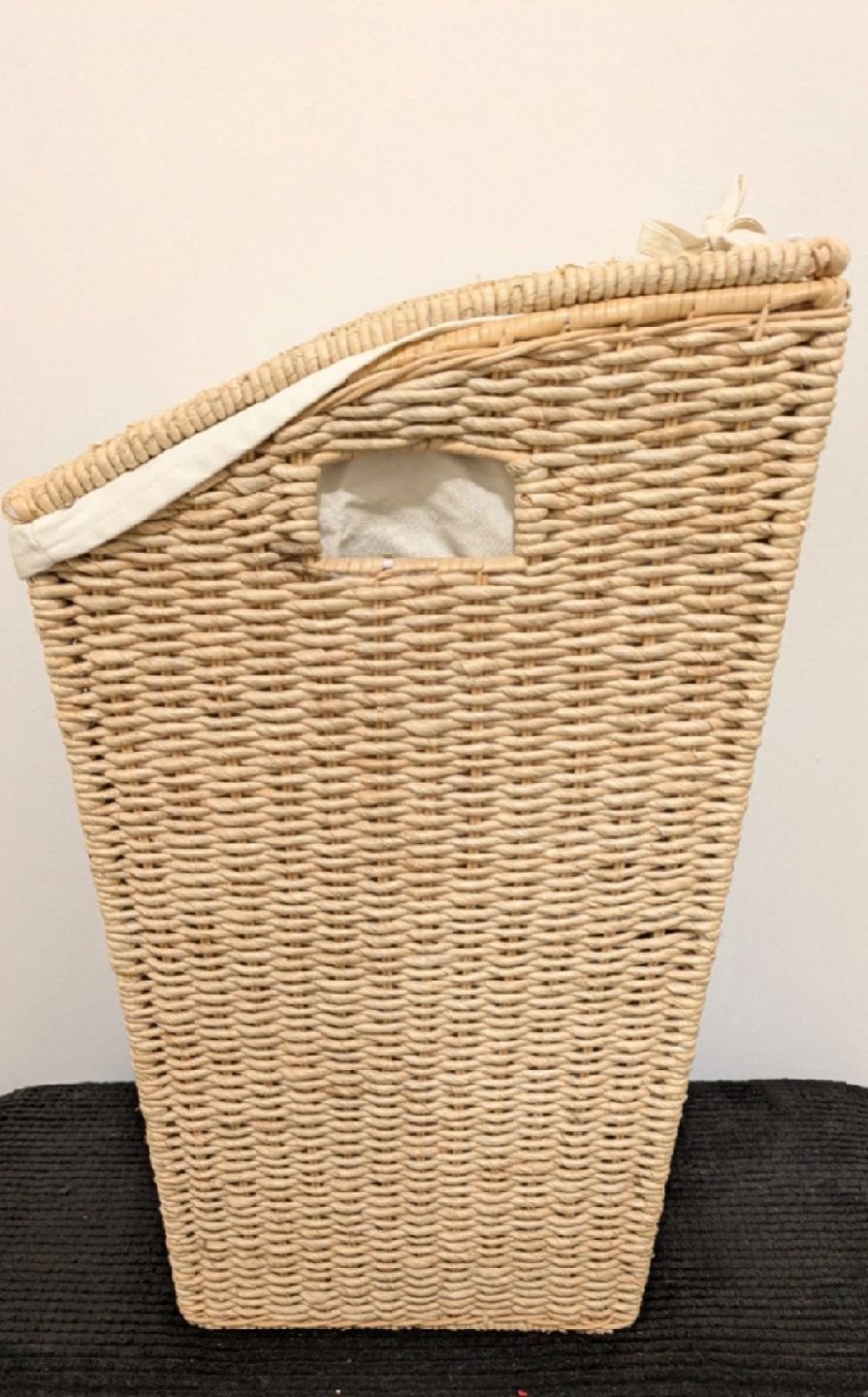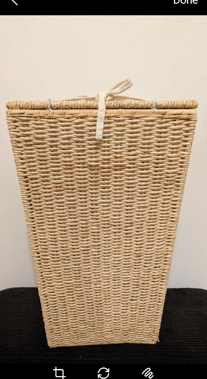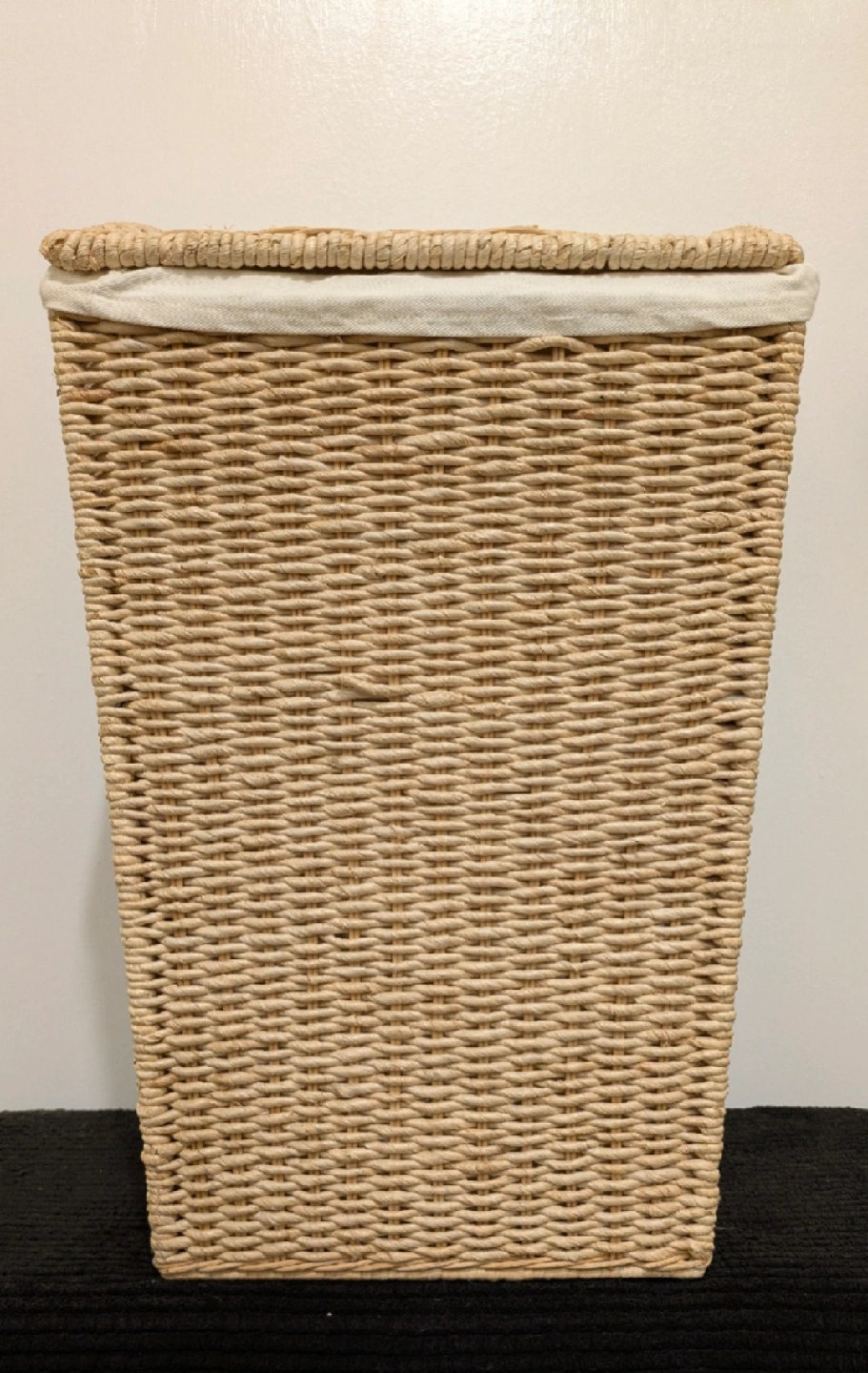 Selling a wicker laundry hamper. lid and removable liner. handle cut outs. firm wire frame measures roughly 14"x14", height is 20" -24" (slopes to the front) cash only
