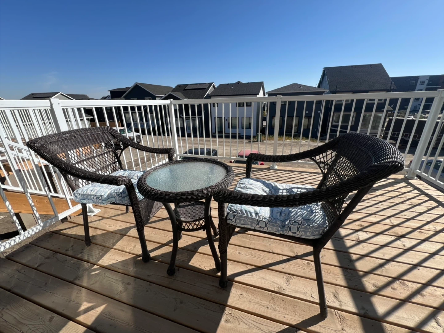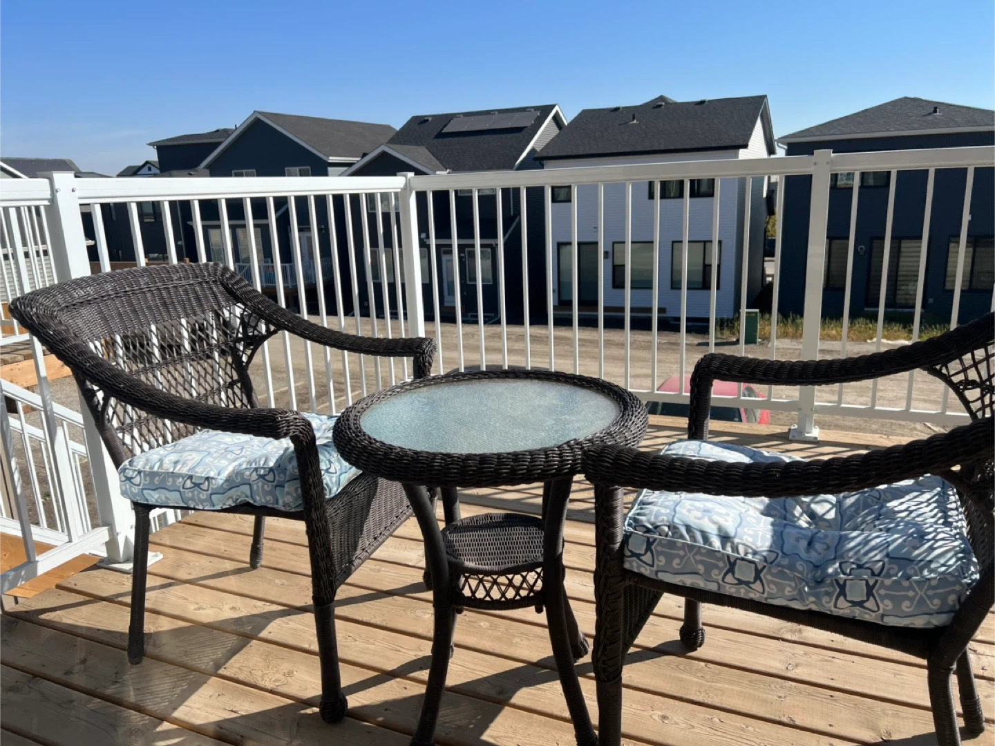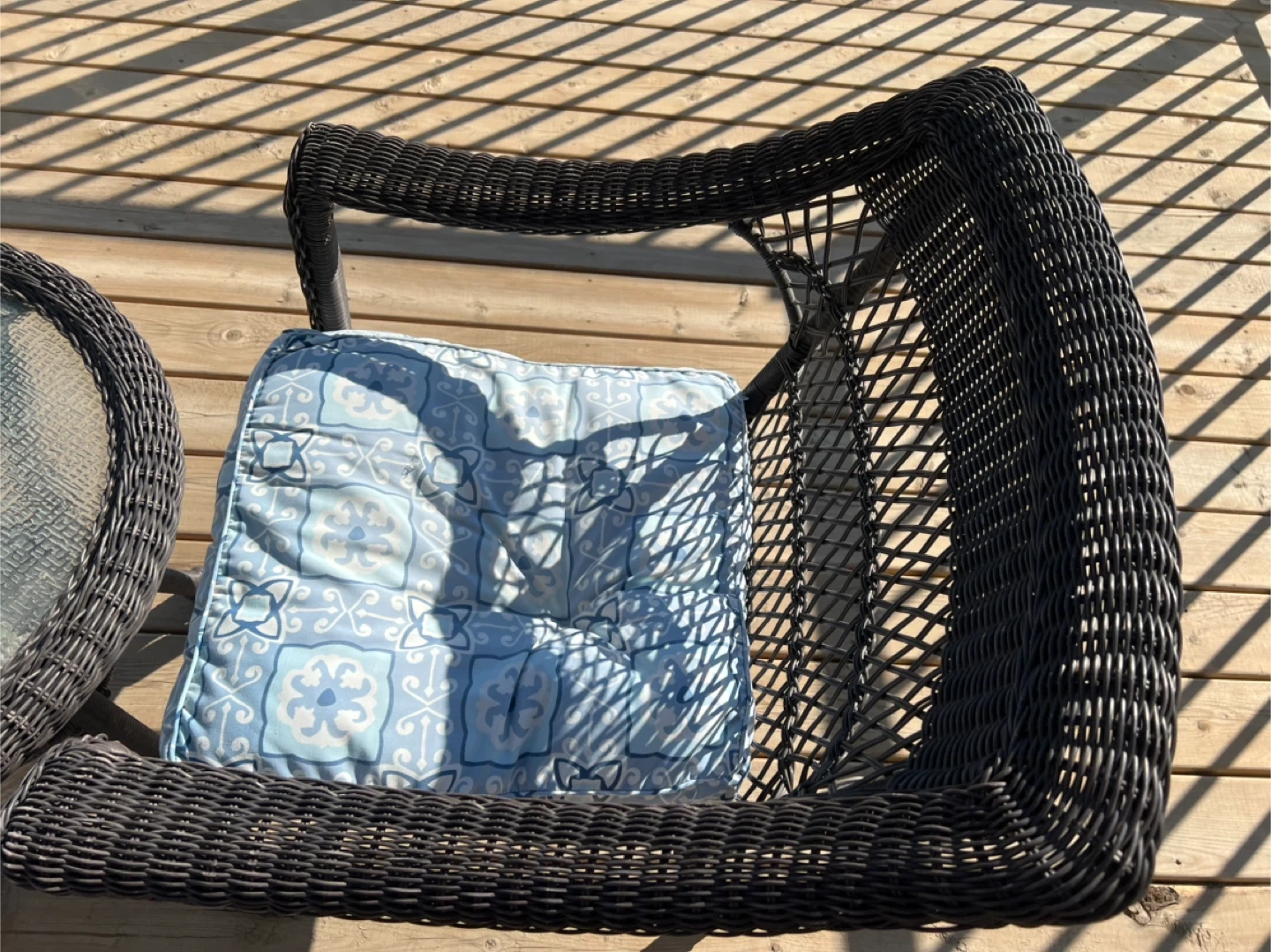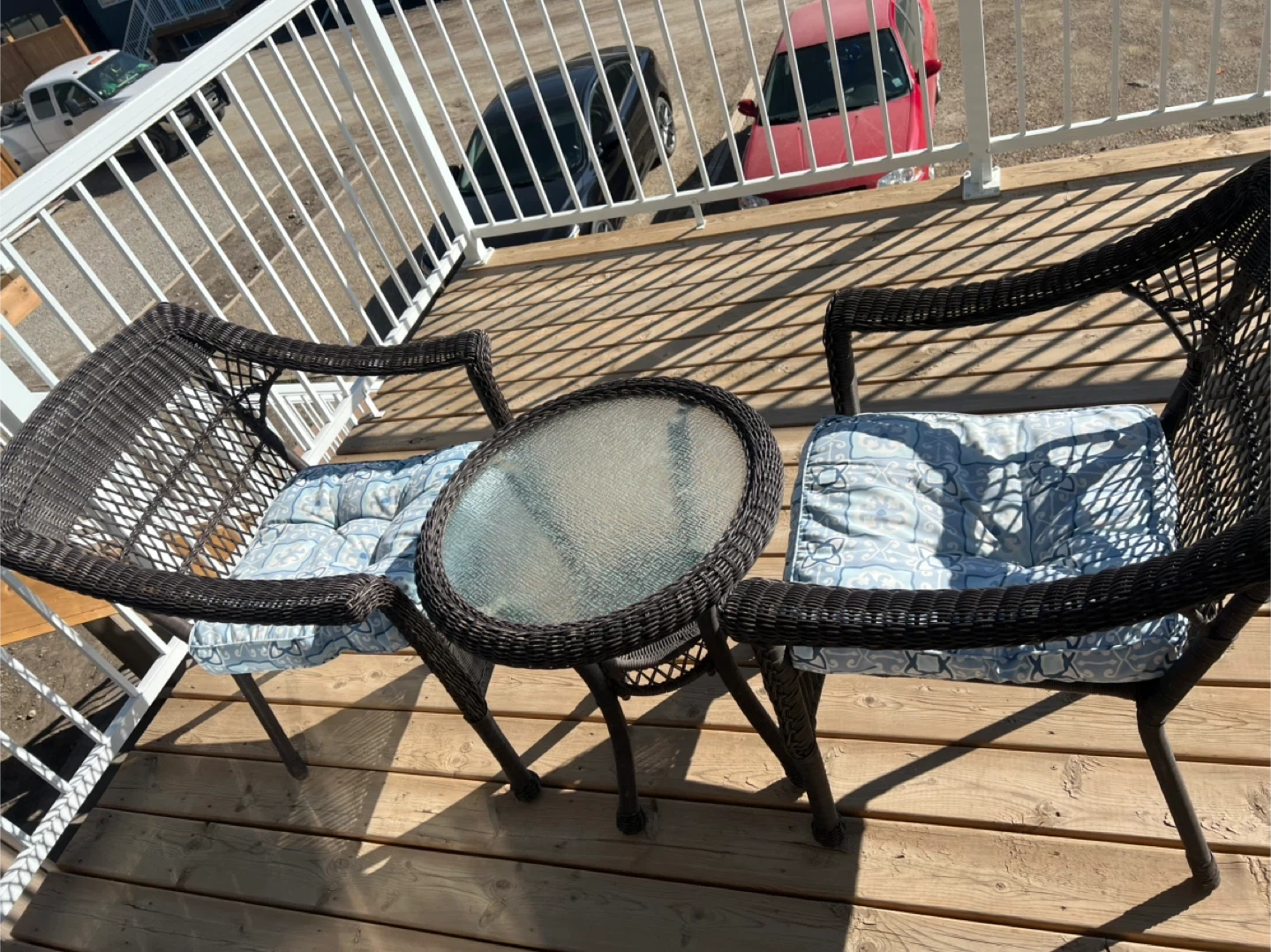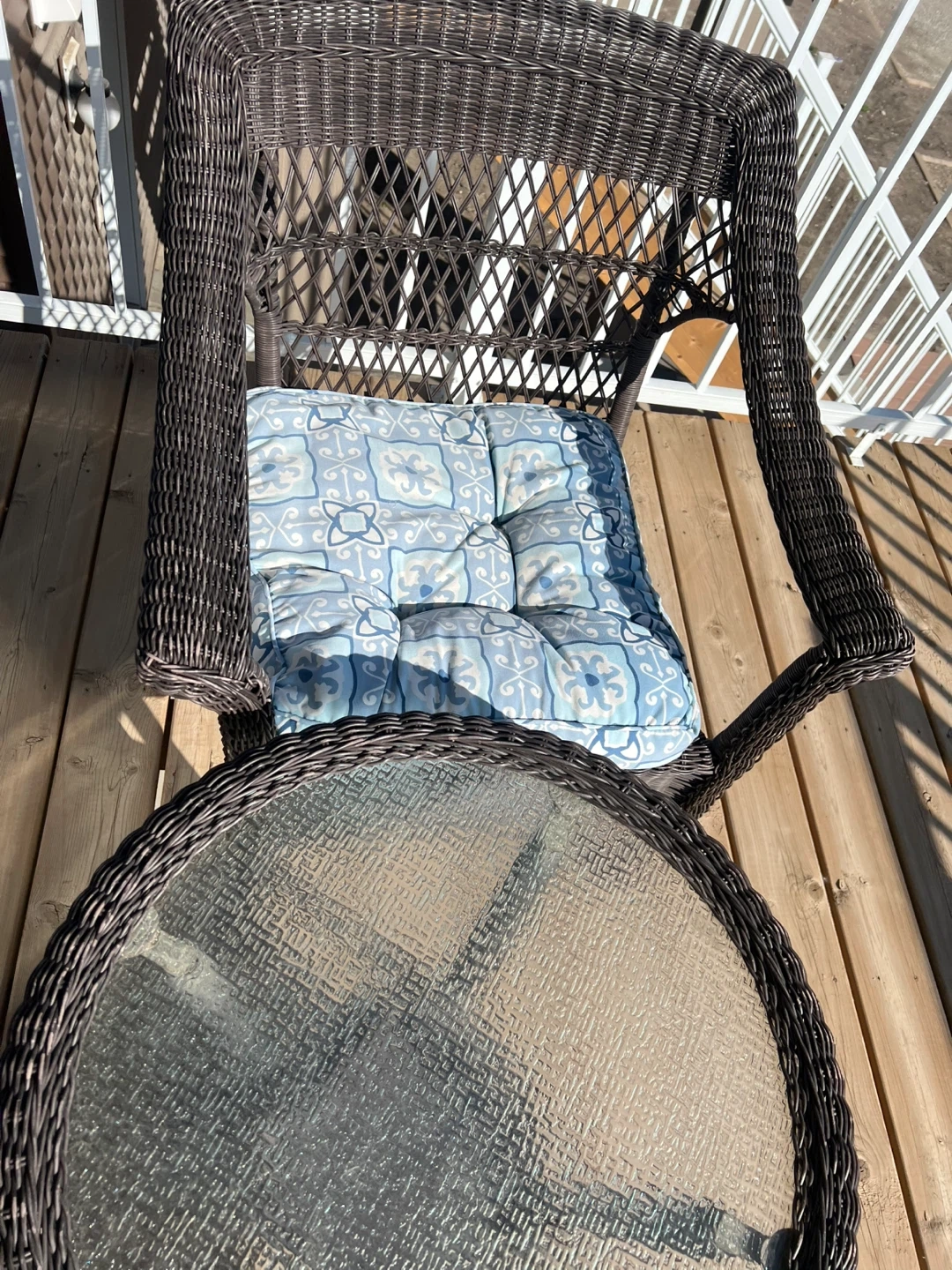 Selling a cute wicker patio set that includes a small glass-topped table and two matching chairs. The cushions have a nice blue and white pattern. Perfect for a small balcony or patio! Enjoy your mornings or evenings outdoors with this cozy 3-piece patio set. • Includes 2 wicker armchairs with seat cushions + 1 round glass-top table • Durable resin wicker design – weather-resistant and easy to clean • Cushions included (light blue/grey patterned, removable) • Perfect for balconies, decks, or small patios • Lightweight but sturdy