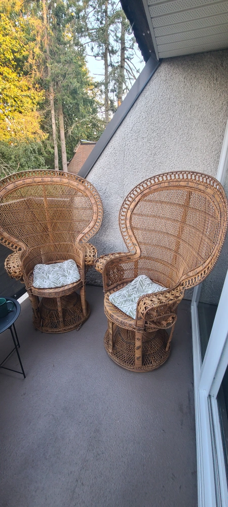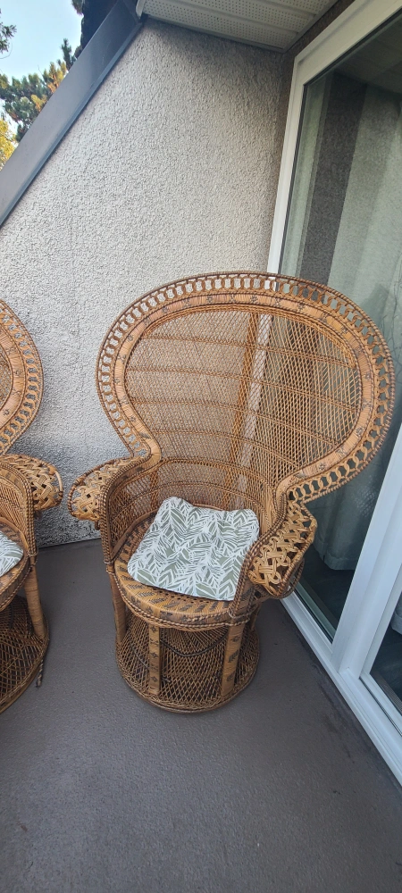 15Selling a wicker peacock chairs. It has a unique, eye-catching design. The chair is made of woven wicker and has a high back that fans out like a peacock's tail. There is some wear on the bottom