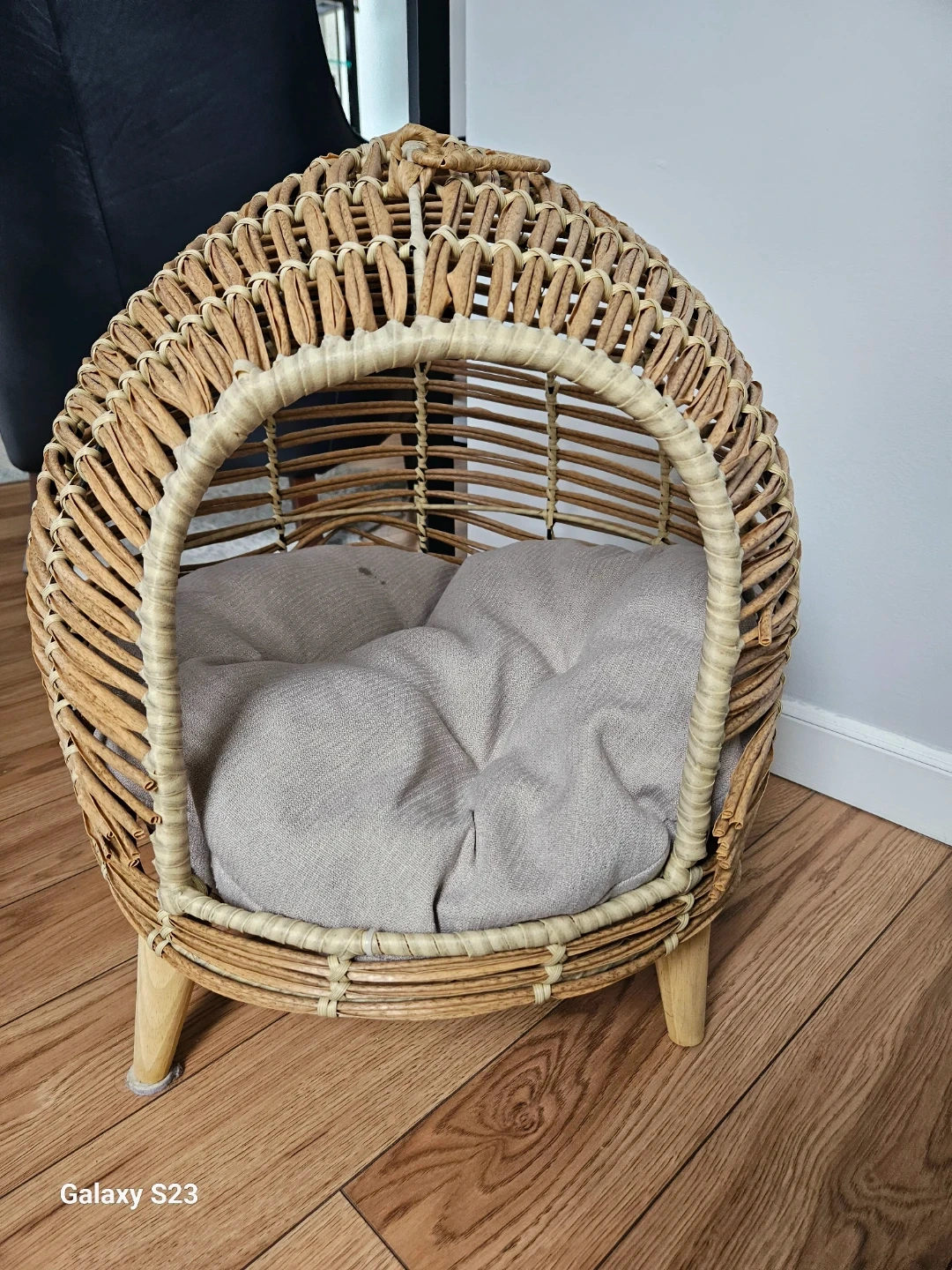 60Selling a cute wicker pet cave bed! It comes with a comfy cushion inside, perfect for your furry friend to curl up in. The natural wicker design will look great in any room of your home. It's in great condition and ready for a new home!