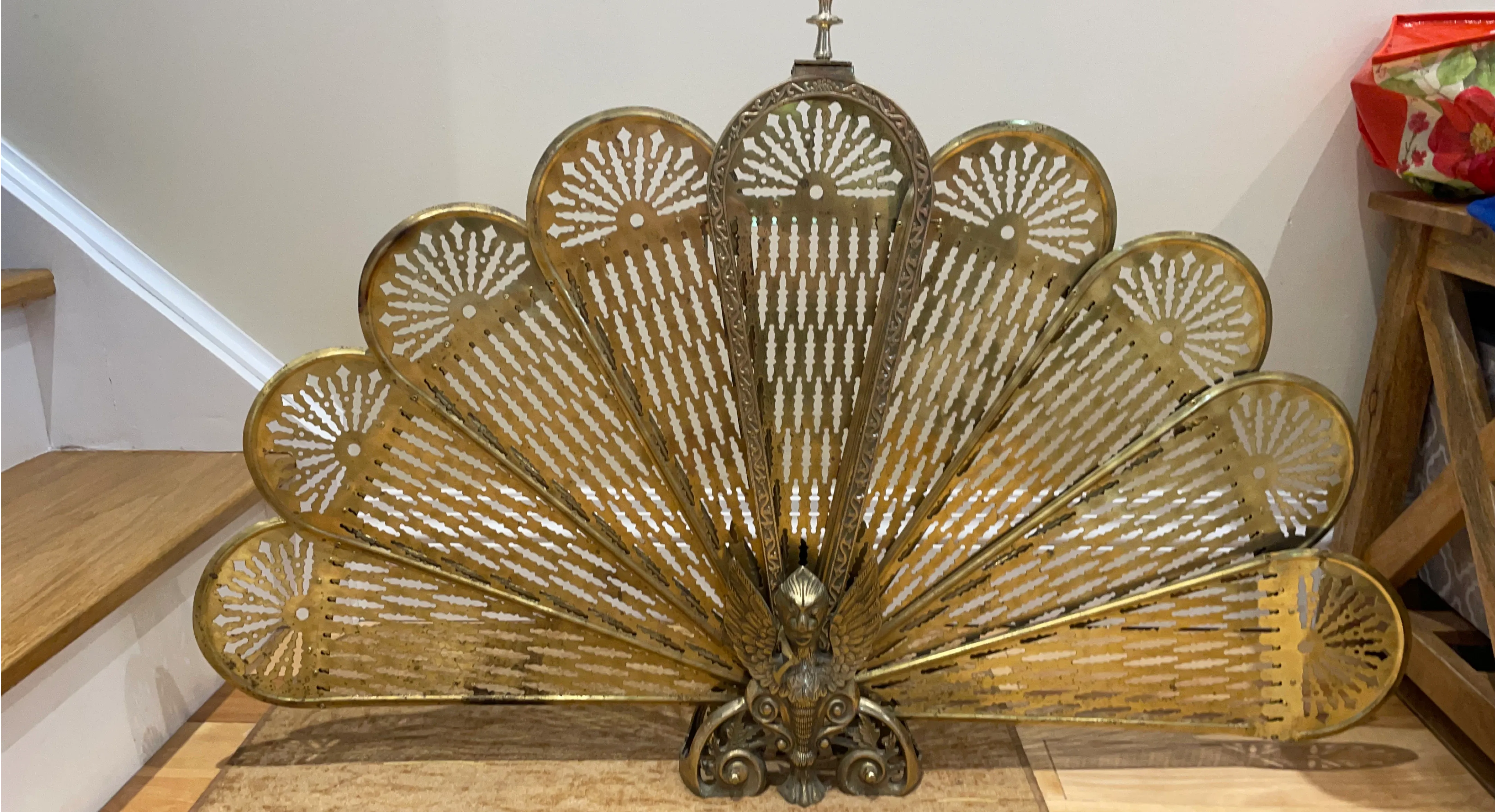 Decorative brass fireplace screen. It's designed like an opening fan with intricate cutouts. This piece adds a touch of vintage charm to any room. Excellent for protecting your hearth from sparks.