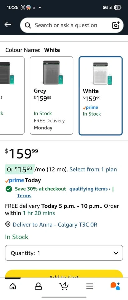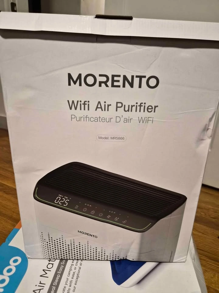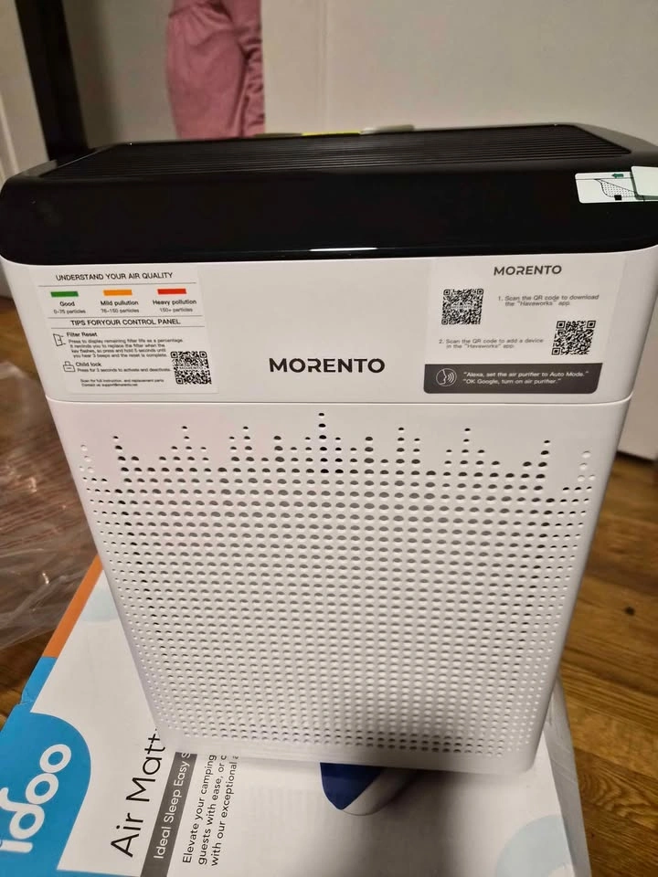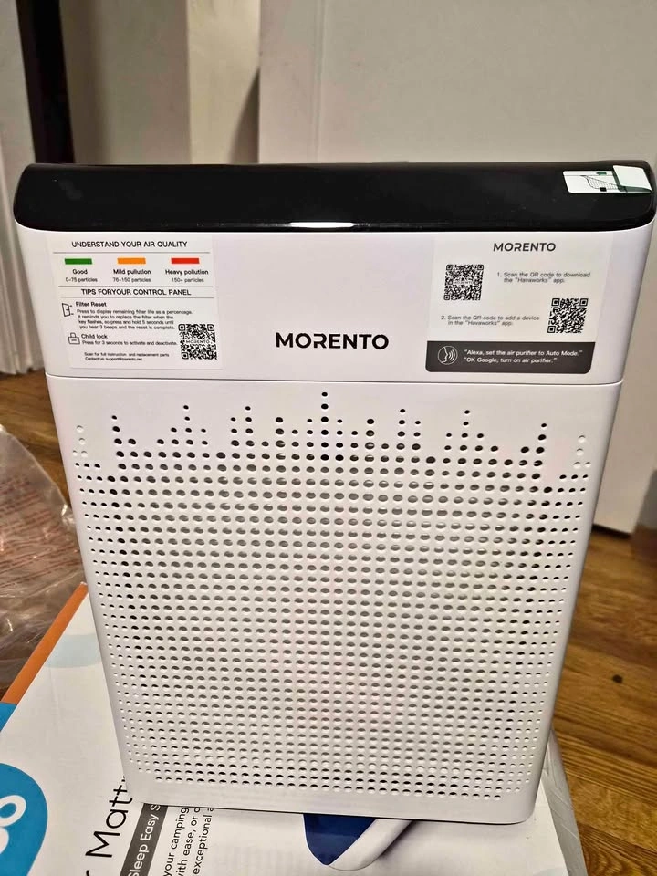 MERONTE air purifier in white. Dimensions are 16.8D x 30.8W x 41H Centimetres. Control via app, touch, or voice. HEPA filter. Good for rooms up to 1690 Square Feet. Connects to the "Havaworks" app for remote operation. Works with Amazon Alexa and Google Assistant. Features an infrared PM2.5 sensor with a 3-color AQI indicator. Sleep mode operates at 23dB with display lights off.