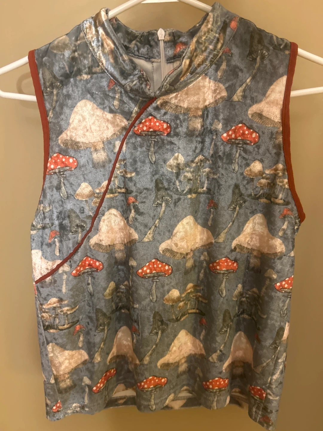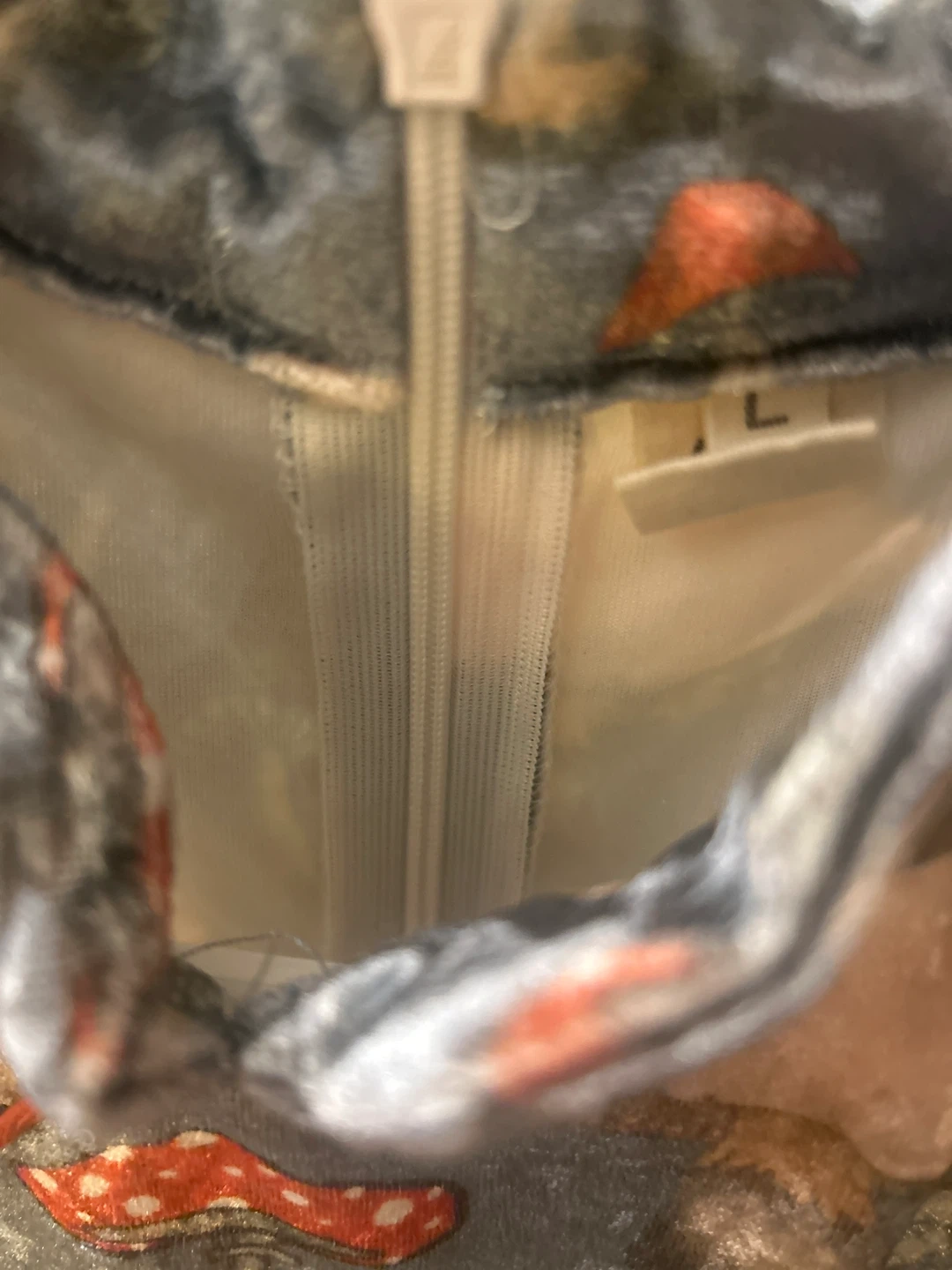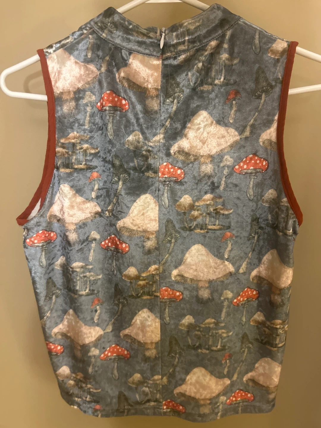 Cute velvet top with a unique mushroom print! It's size L but fits like S and it’s in great condition. The material is soft and comfortable, perfect for adding a bit of whimsy to your wardrobe.