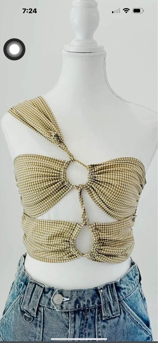 Checkered crop top with cutout and ring details. One-shoulder design. It's made of a lightweight fabric.