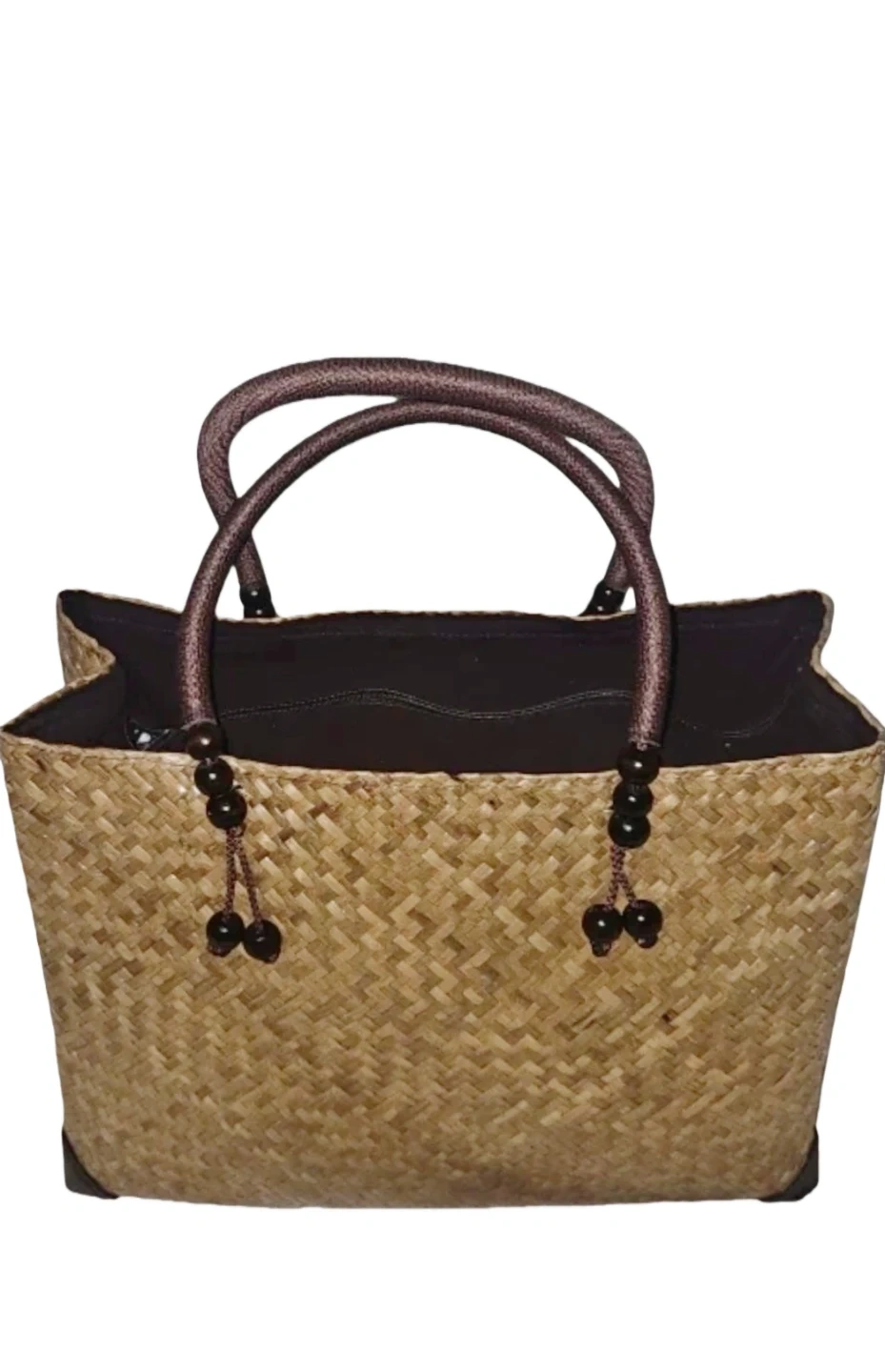 Selling a brand new, handmade, classy woven straw tote bag! It features elegant brown handles with bead accents and a dark brown fabric lining. Perfect for summer, your next beach vacation, or even as stylish laptop storage 💻