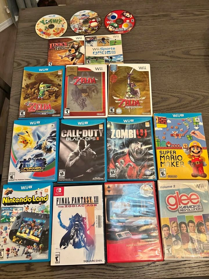 74Final Fantasy SOLD Zelda windbreaker 80.00 Twilight Princess 25.00 Skyward sword 35.00 Pokken Tournament 20.00 Call of Duty Black Ops 15.00 Zombie U 10.00 Nintendo land 10.00 Glee Karaoke 5.00 Yoshis Woolly world 10.00 game no case. Scribblenauts unlimited 2.00 game only Super Mario Bros game only 5.00 Super Mario History 8.00 Links crossbow training 10.00 Wii Sports 10.00 Super Mario Maker complete 20.00 Cash only no trades thx. Northwest Edmonton