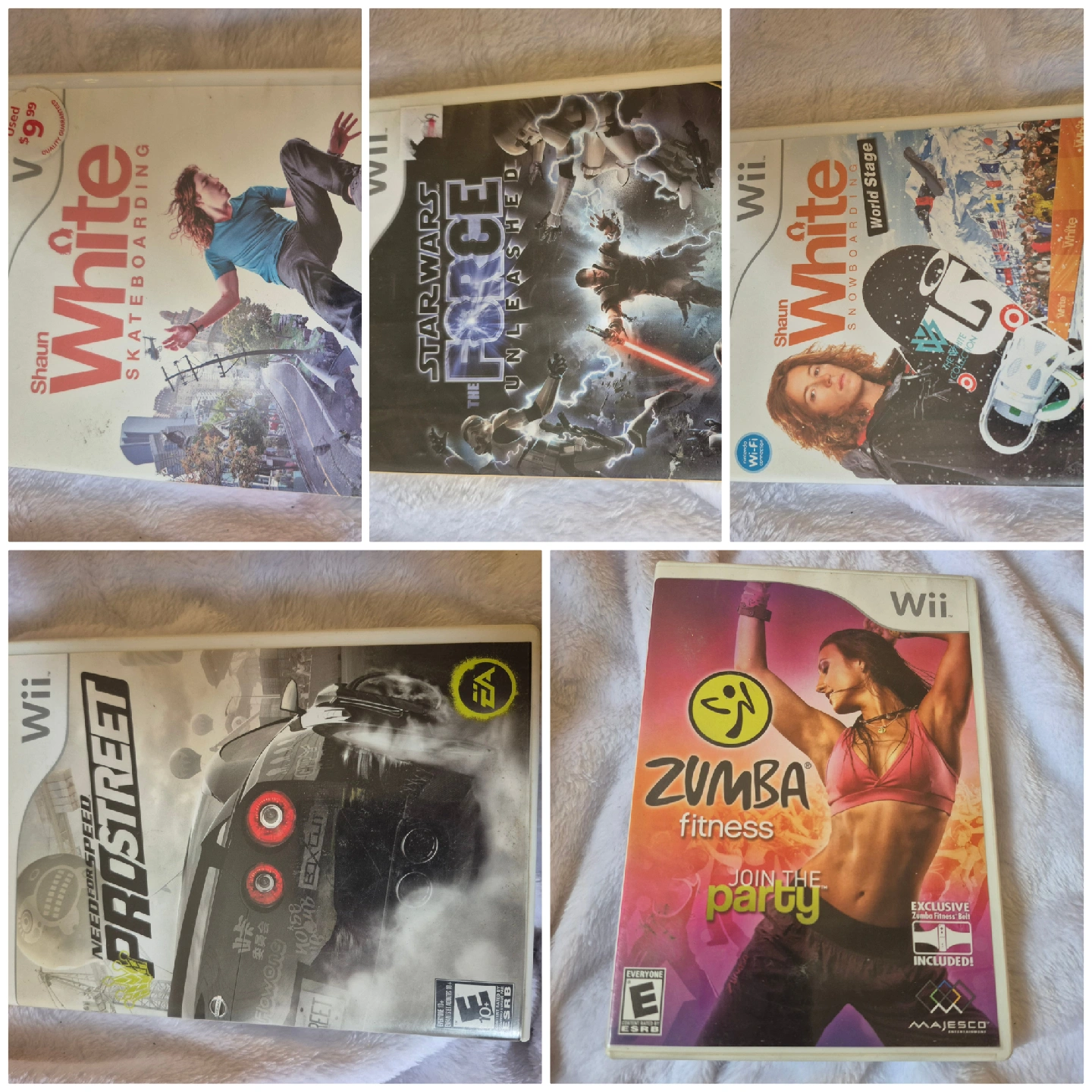 70Selling a few Wii games! Titles include: - Shaun White Skateboarding - Star Wars The Force Unleashed - Need For Speed ProStreet - Zumba Fitness 5 each or 20 for all