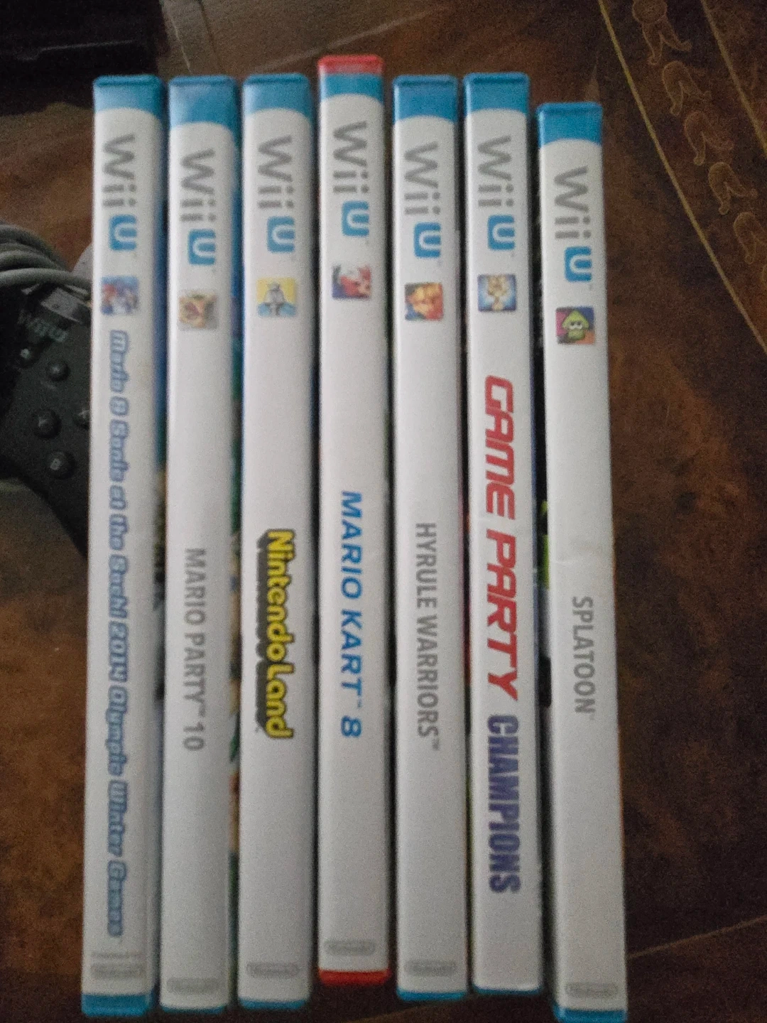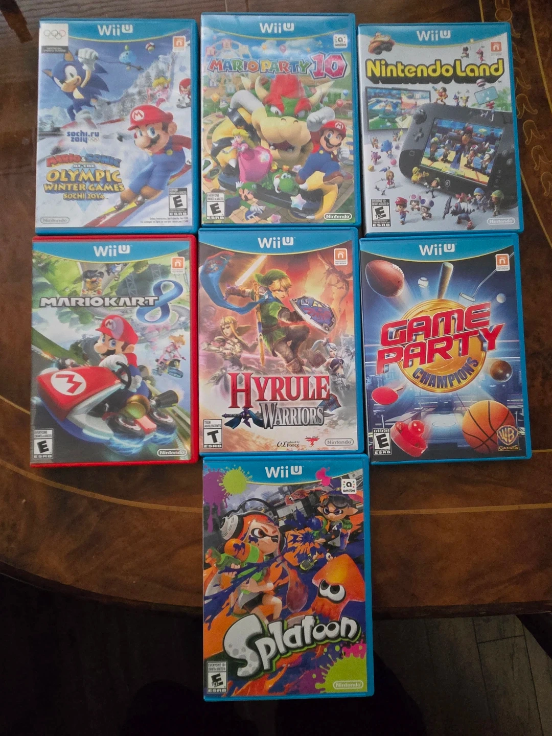 55Selling a collection of Wii U games $15 each or the group for $90 Titles include: - Mario Party 10 - Mario Kart 8 - Splatoon - Nintendo Land - Hyrule Warriors - Mario & Sonic at the Sochi 2014 Olympic Winter Games - Game Party Champions Great way to boost your Wii U collection All Games are used but in Great condition and include all instruction manuals and original inserts Check my other listings for possible group discounts