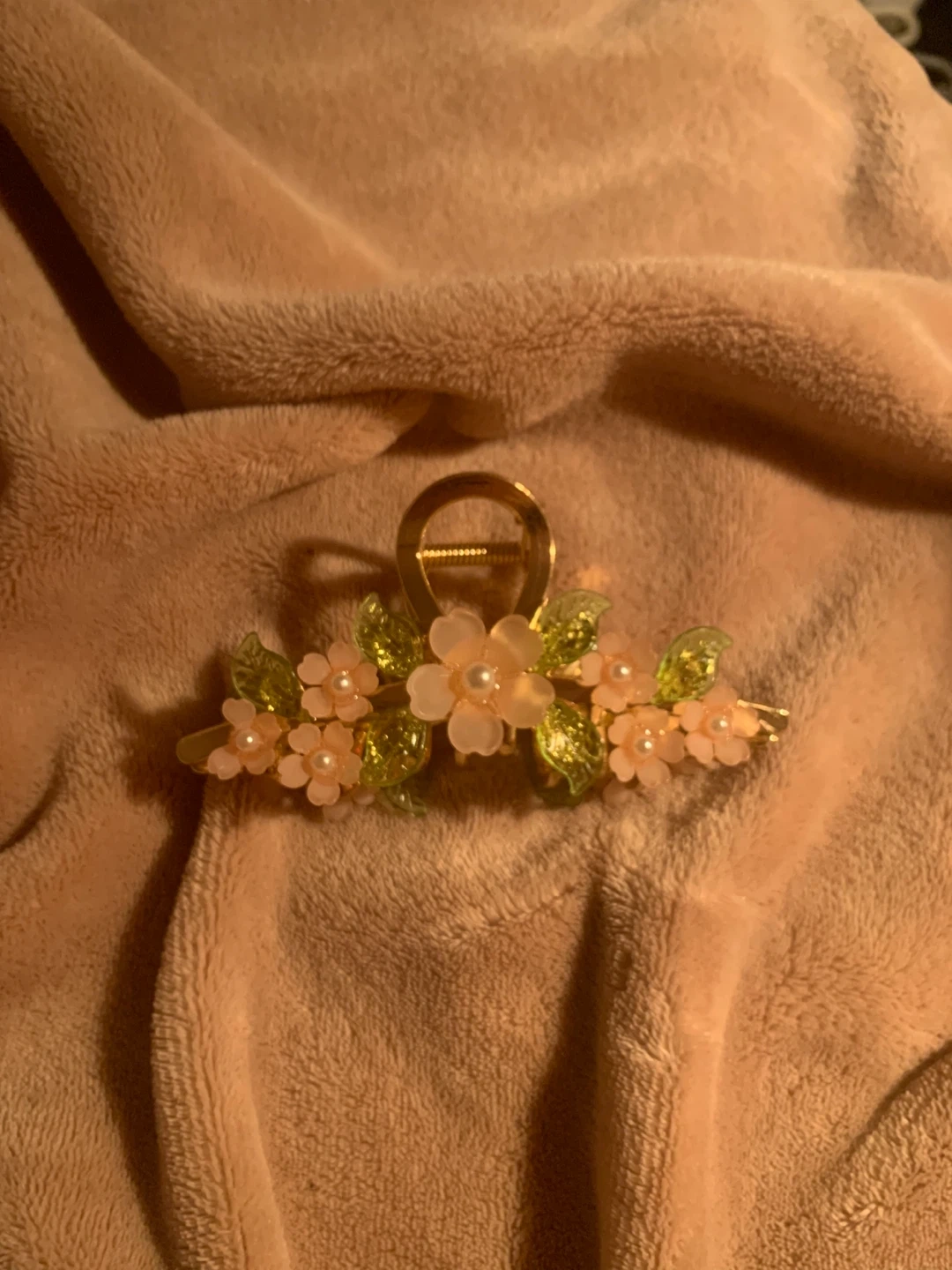 Selling three different hair claw clips. One is an amber-coloured clam-style clip. Another is a white star-shaped clip. The third is a decorative clip with pink flowers and green leaves. Great for securing hair! $5 each!