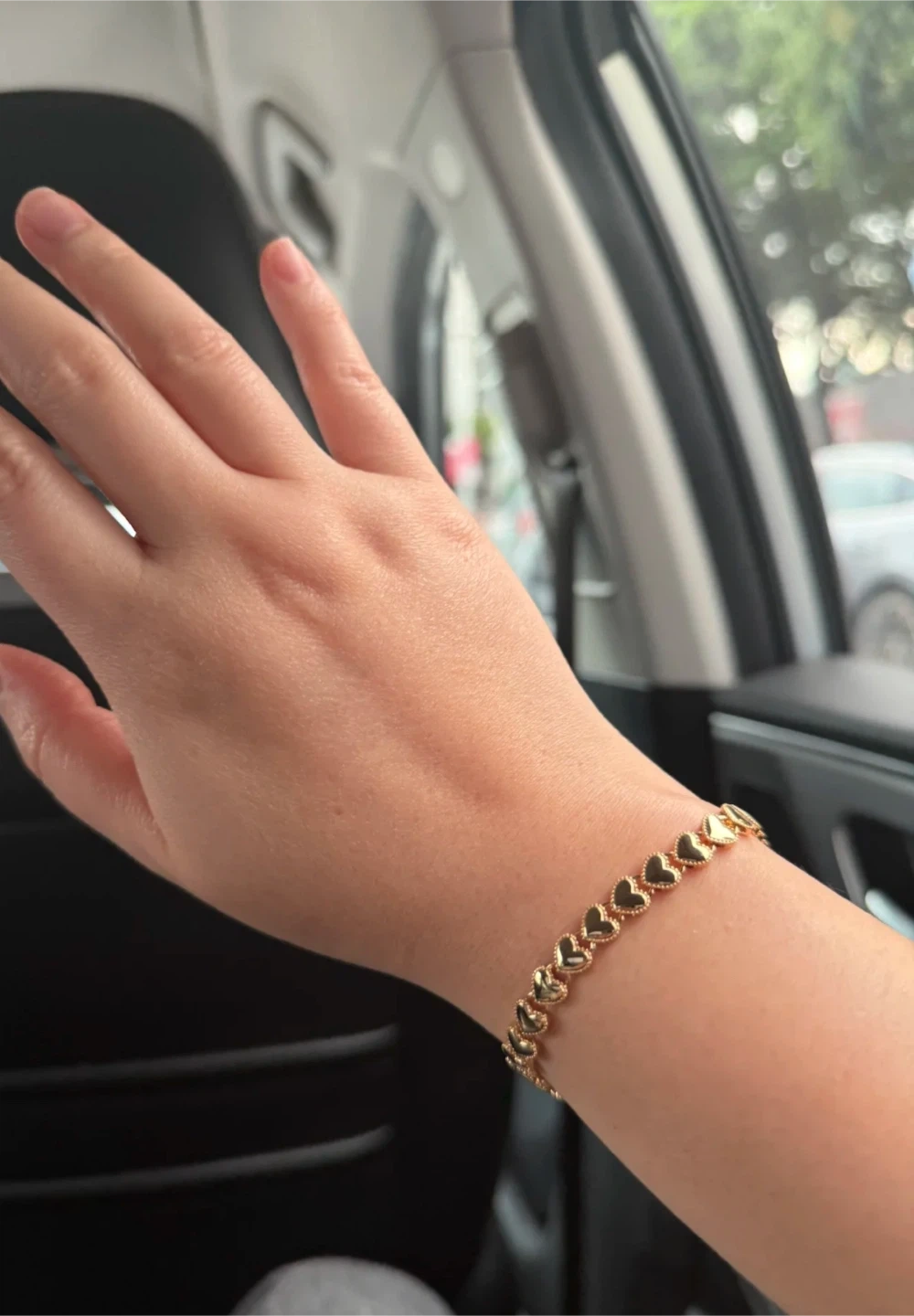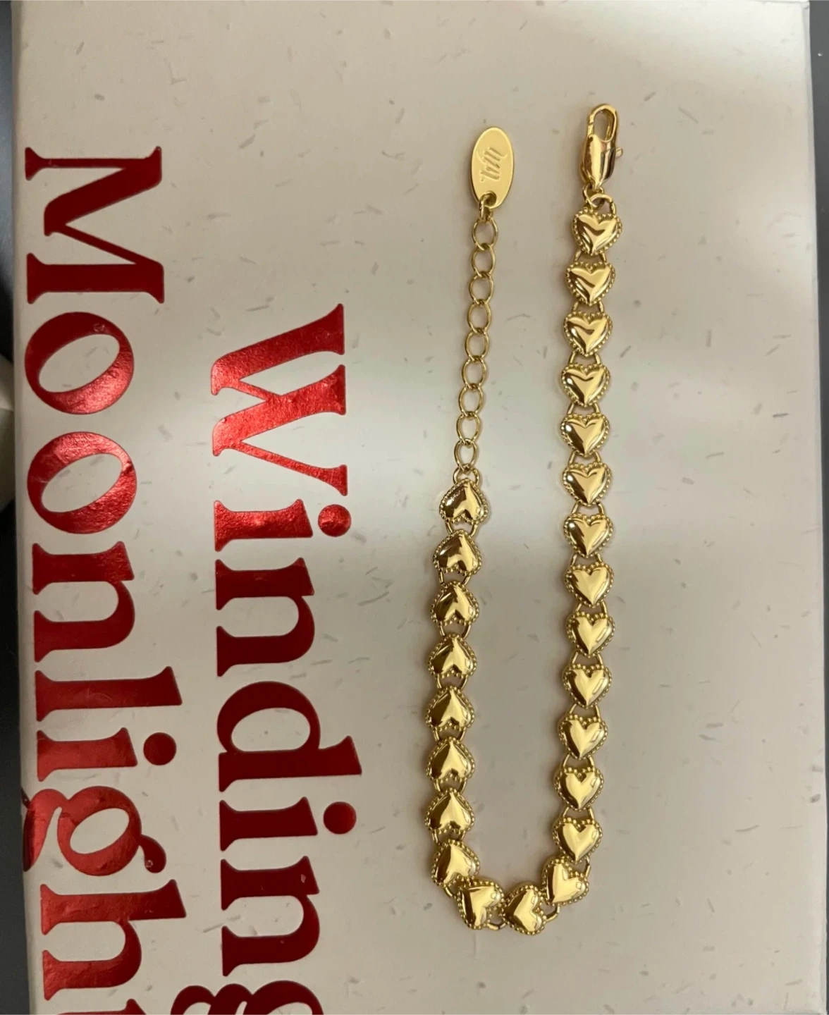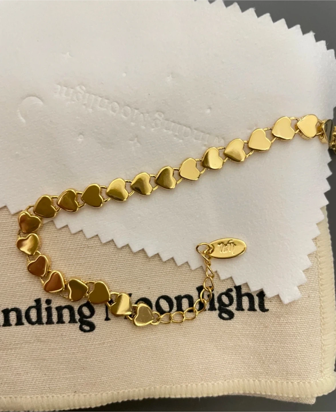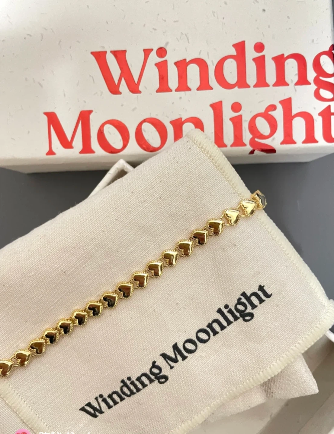 This Winding Moonlight bracelet features a delicate chain with alternating gold hearts. It has an adjustable clasp for a comfortable fit. This piece adds a lovely touch of sparkle!