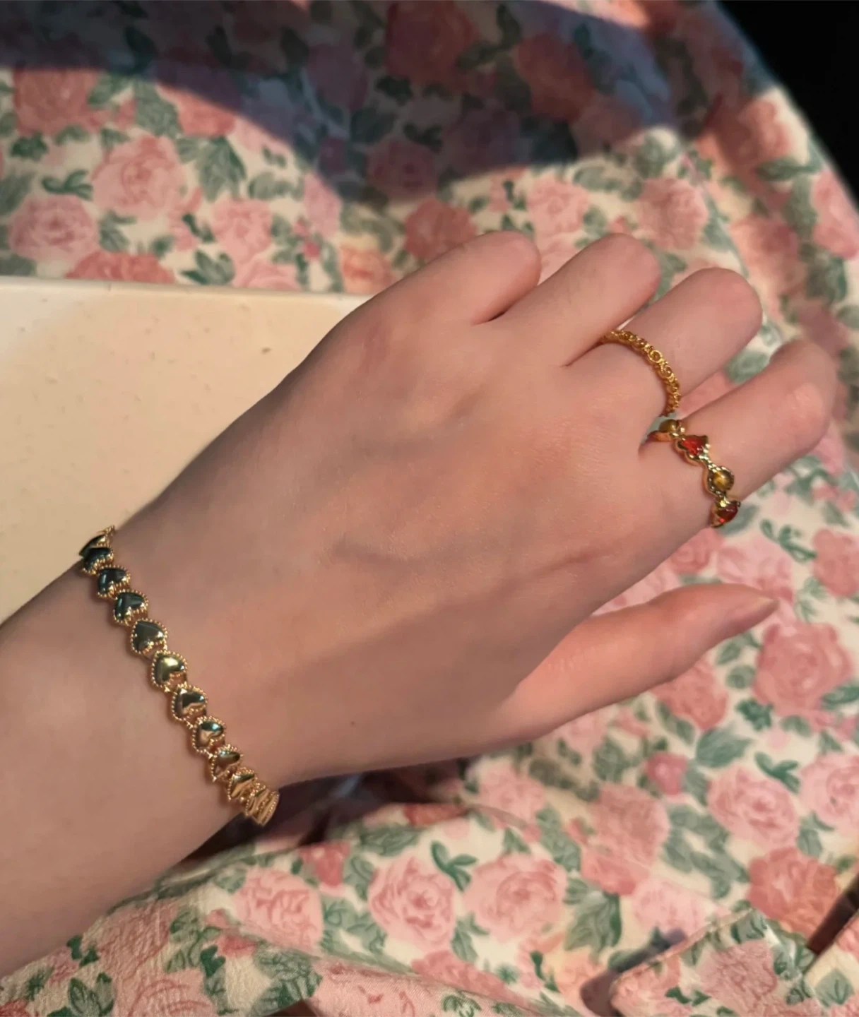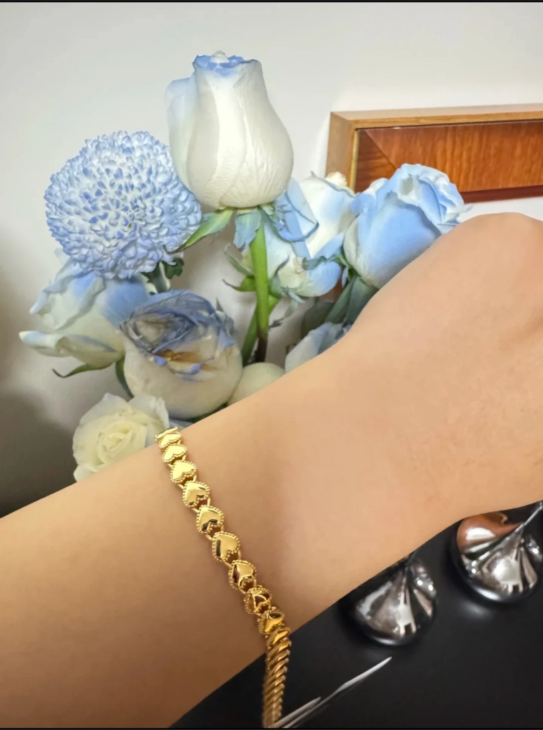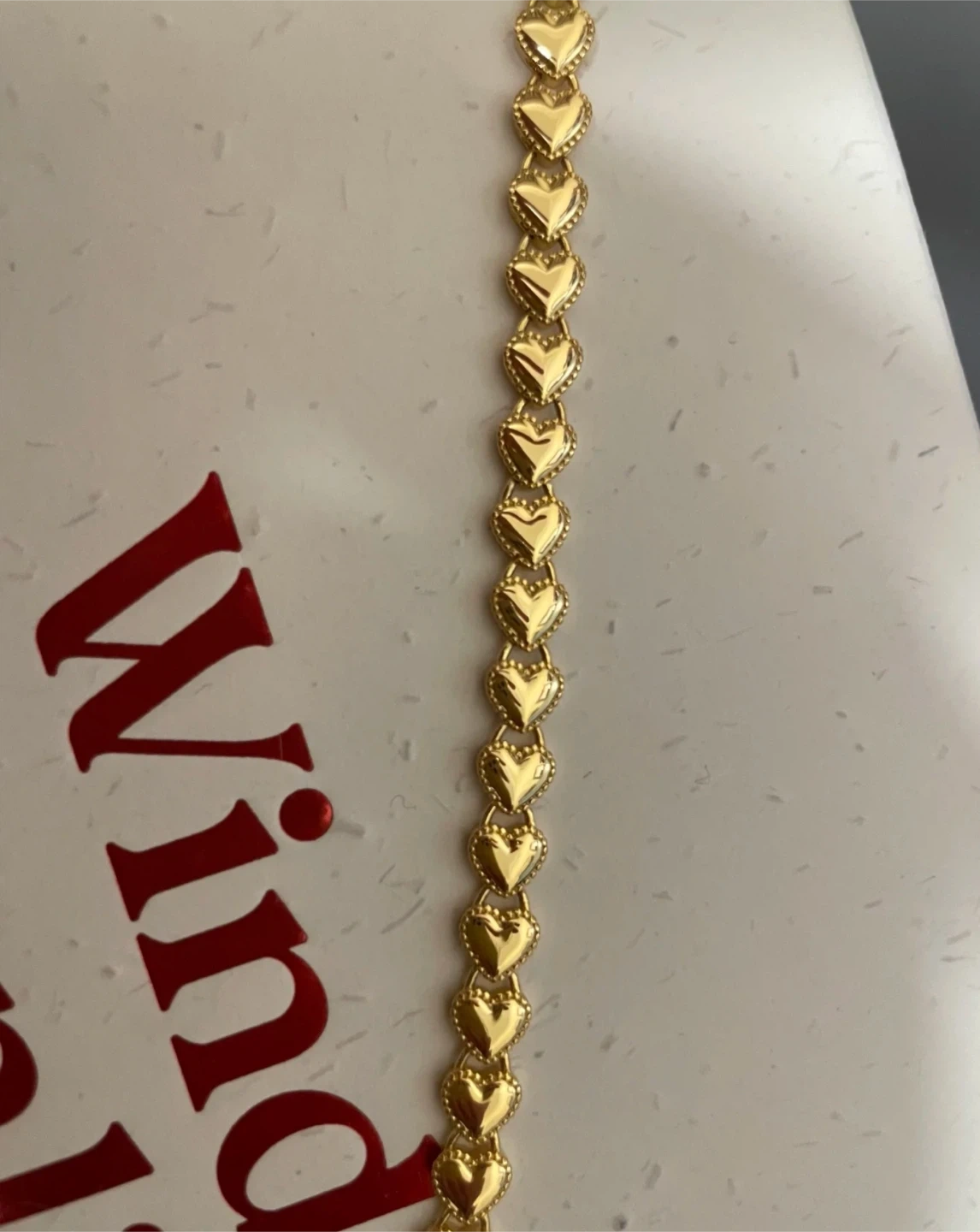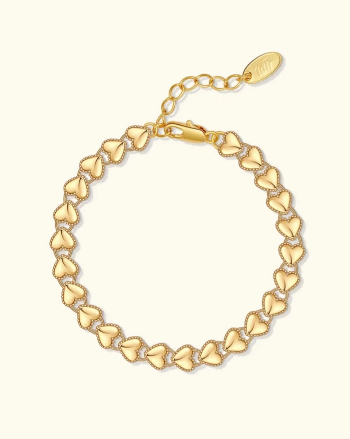 This Winding Moonlight bracelet features a delicate chain with alternating gold hearts. It has an adjustable clasp for a comfortable fit. This piece adds a lovely touch of sparkle!