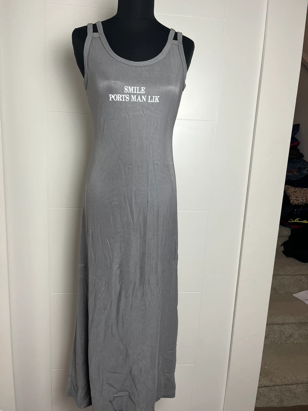 Selling a cute grey dress from 2S The Studio 235! It features the text "SMILE PORTS MAN LIK" on the front. It's a size small and in great condition!