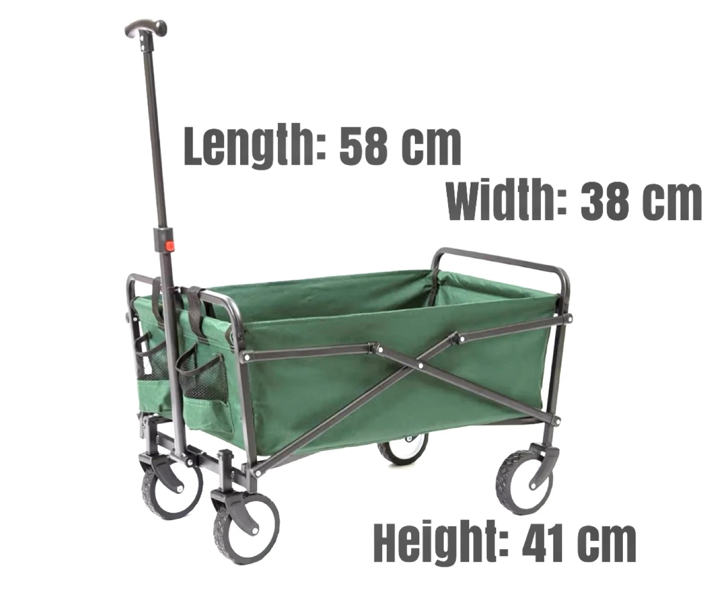 A handy green folding wagon cart for hauling gear. It's designed with a durable frame and fabric. Dimensions are 58 cm long, 38 cm wide, and 41 cm high. This cart is useful for trips to the park, beach, or backyard.