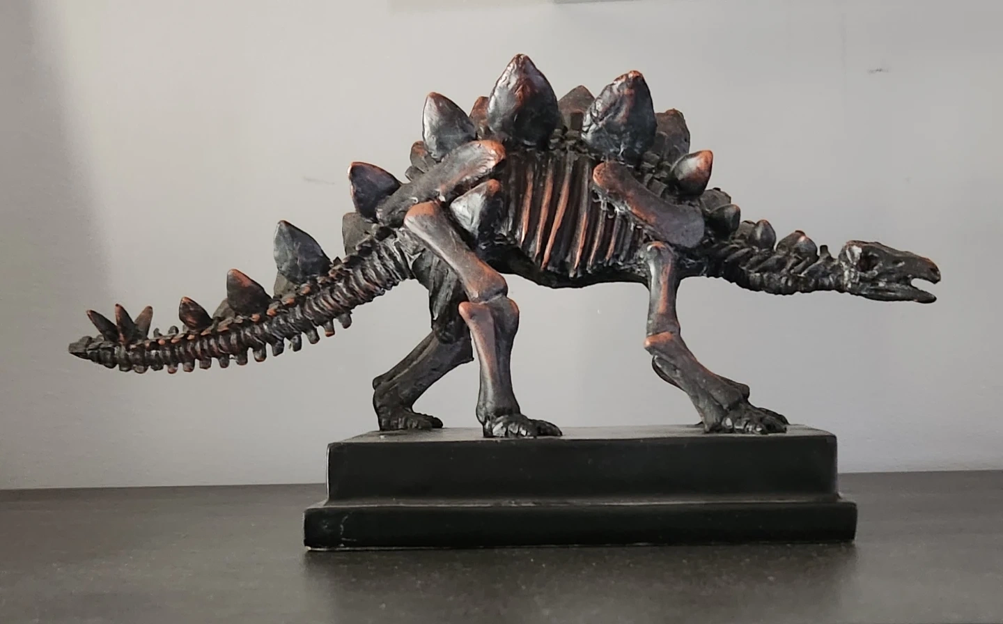 A detailed Stegosaurus skeleton statue. It's made of a dark, metallic material with bronze accents on the bones and plates. The statue sits on a black rectangular base.
